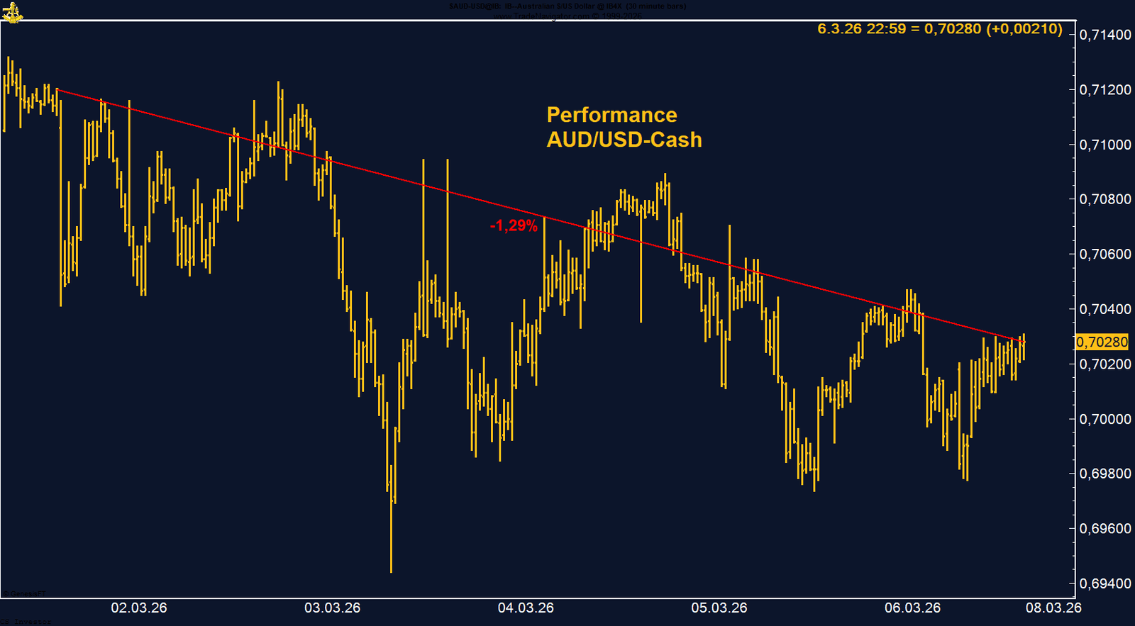 Der Austral-Dollar zeigte sich in der vergangenen Woche volatil und konnte den Hochbereich um 0,71 nicht halten. Auf Wochenbasis verlor der AUD gegenüber dem US-Dollar 1,29 % und schloss bei 0,7028. Zu Wochenbeginn notierte das Währungspaar noch nahe der bisherigen Jahreshochs im Bereich von 0,7140 bis 0,7150, geriet im weiteren Verlauf jedoch zunehmend unter Druck und fiel zeitweise wieder unter die psychologisch wichtige Marke von 0,70.Treiber der Bewegung waren vor allem eine stärkere Nachfrage nach dem US-Dollar sowie eine erhöhte Risikoaversion an den Märkten. Der eskalierende Konflikt im Nahen Osten führte zu klassischen Safe-Haven-Strömen in den US-Dollar, während der Austral-Dollar als zyklische Risiko-Währung unter Abgabedruck geriet.