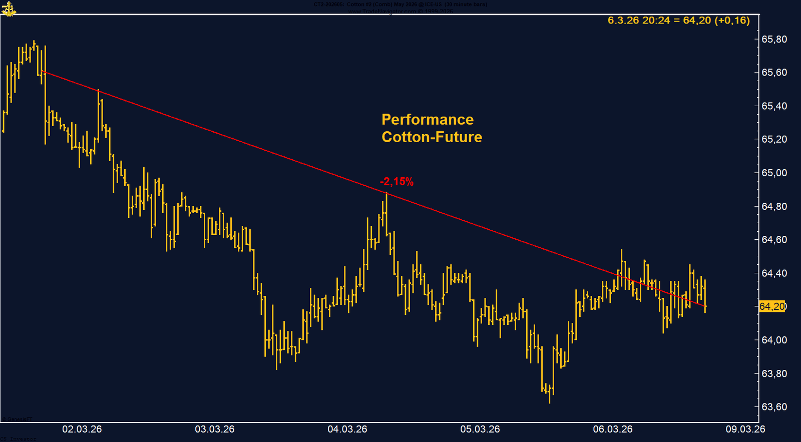 Der US-Baumwolle-Future verzeichnete in der vergangenen Woche eine schwache Entwicklung und verlor auf Wochenbasis 2,15 %. Der Kontrakt schloss bei 64,2 US-Cent pro Ballen. Bereits zu Beginn der Woche setzte Verkaufsdruck ein, und der Markt konnte sich im weiteren Verlauf nicht mehr nachhaltig erholen. Die Kurse bewegten sich damit nahezu durchgehend abwärtsgerichtet.