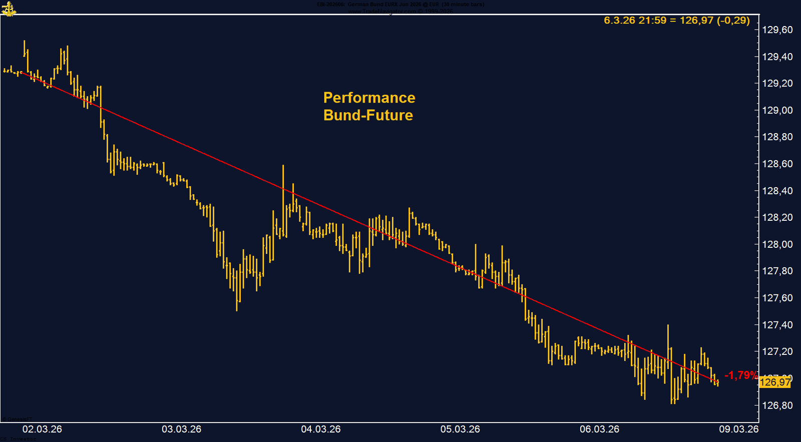 Der Euro-Bund-Future zeigte in der vergangenen Woche zunächst eine starke Aufwärtsbewegung. Mit der Eskalation der geopolitischen Spannungen im Nahen Osten setzte eine klassische Safe-Haven-Reaktion ein, von der deutsche Staatsanleihen als sicherer Hafen profitierten. Der Future zog deutlich an und erreichte zu Wochenbeginn ein Hoch bei 129,52 Punkten.Diese Bewegung erwies sich jedoch erneut als nicht nachhaltig. Nach dem Erreichen des Hochs drehte der Markt deutlich nach unten und wurde im weiteren Verlauf der Woche kräftig abverkauft. Der Bund-Future fiel schließlich bis auf 126,97 Punkte zurück und gab damit einen großen Teil der zuvor erzielten Gewinne wieder ab.