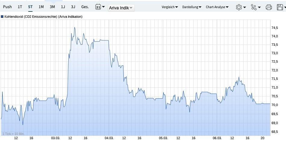 Die CO₂-Zertifikate im europäischen Emissionshandel (EU ETS) zeigten in der vergangenen Woche eine weitgehend stabile Entwicklung. Auf Wochenbasis legte der Preis leicht um 0,22 % zu und schloss bei 70,08 Euro. Die Bewegung unterstreicht, dass sich der Markt derzeit in einer Phase relativer Stabilisierung befindet, nachdem die Preise in den vergangenen Monaten deutlich schwankten.Im politischen Umfeld bleibt das Thema jedoch weiterhin umstritten. Innerhalb mehrerer EU-Staaten wird zunehmend darüber diskutiert, ob die CO₂-Bepreisung angesichts steigender Energiekosten und wachsender Belastungen für Verbraucher und Industrie angepasst oder zeitweise ausgesetzt werden sollte. Diese Debatten sorgen regelmäßig für Unsicherheit am Markt und beeinflussen die Erwartungen der Marktteilnehmer.
