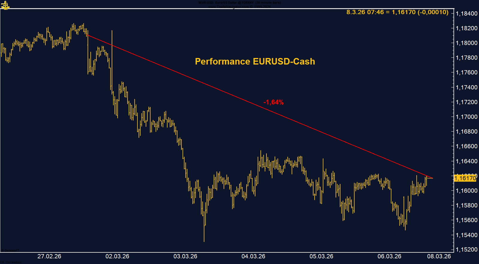 Mit der Eskalation des Konflikts im Nahen Osten kam es zu einer klassischen Fluchtbewegung in den US-Dollar. In Phasen geopolitischer Unsicherheit bleibt der Greenback für viele Marktteilnehmer weiterhin die wichtigste Reserve- und Sicherheitswährung, was entsprechend Druck auf andere große Währungen wie den Euro ausübte.