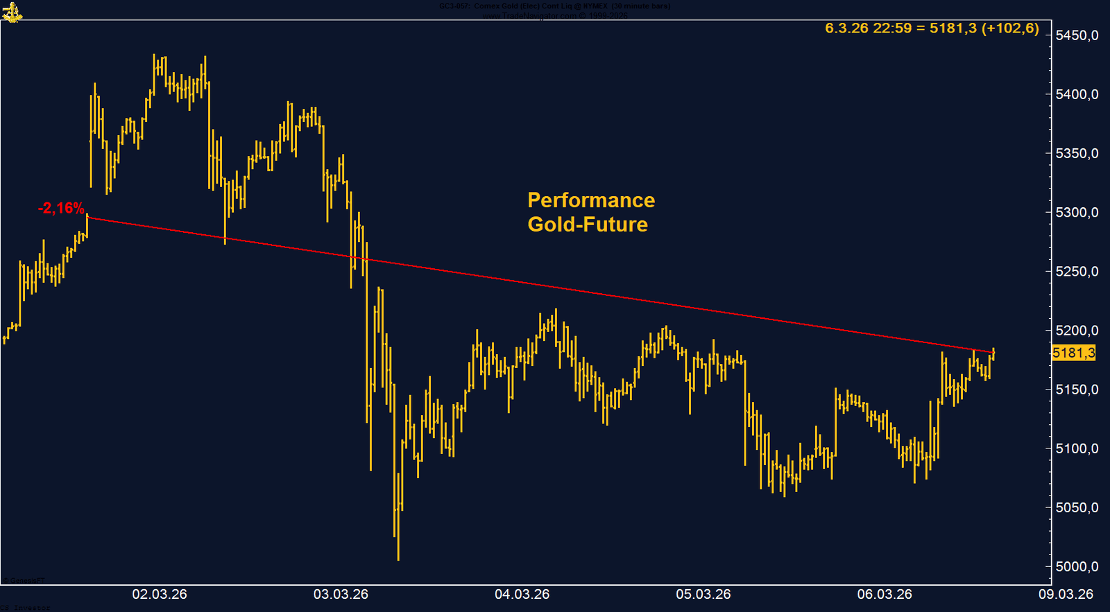 Der Gold-Future an der CME zeigte in der vergangenen Woche eine Korrektur und verlor auf Wochenbasis 2,16 %. Der Kontrakt schloss bei 5.181,3 US-Dollar je Unze und beendete damit eine Phase sehr starker Kursanstiege der vergangenen Wochen und Monate.