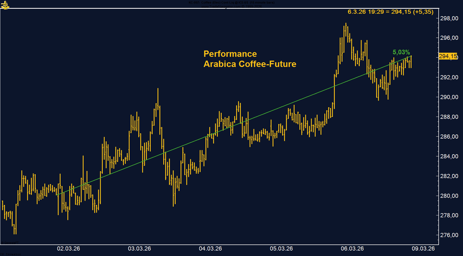 Der Arabica-Kaffee-Future an der ICE US zeigte in der vergangenen Woche eine sehr starke Entwicklung. Der Kontrakt legte um 5,03 % zu und schloss bei 294,15 US-Cent pro Pfund. Die Kursbewegung verlief dabei nahezu durchgehend nach oben, sodass der Markt nahe dem Wochenhoch aus dem Handel ging.