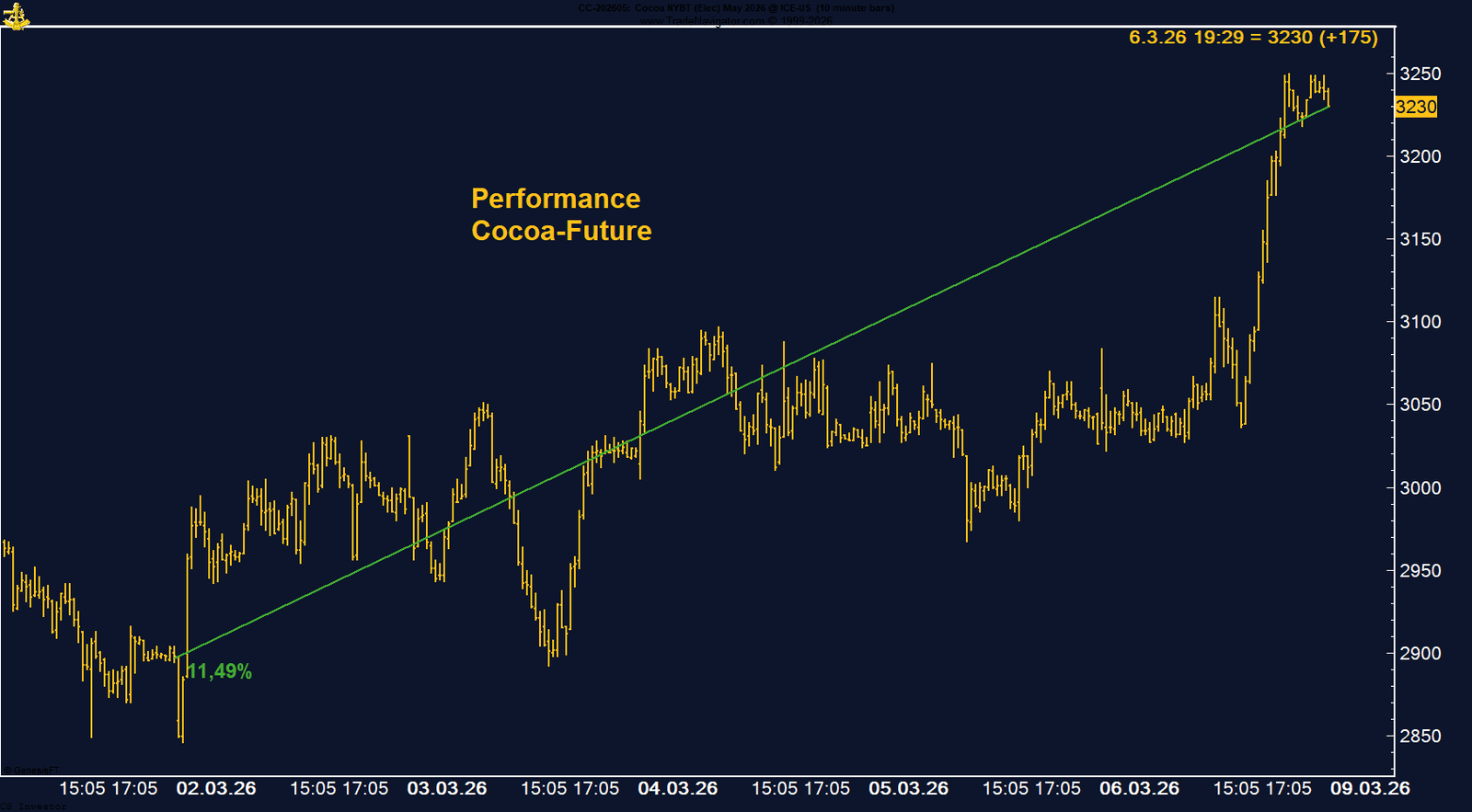 Der Kakao-Future an der ICE US zeigte in der vergangenen Woche eine sehr starke Gegenbewegung. Der Kontrakt legte um 11,49 % zu und schloss bei 3.230 US-Dollar pro Tonne. Zu Wochenbeginn hatte der Markt noch deutlich schwächer notiert und ein Tief bei rund 2.846 US-Dollar markiert. Von diesem Niveau aus setzte jedoch eine kräftige Erholung ein, die den Preis bis zum Ende der Woche nahezu auf das Wochenhoch führte.
