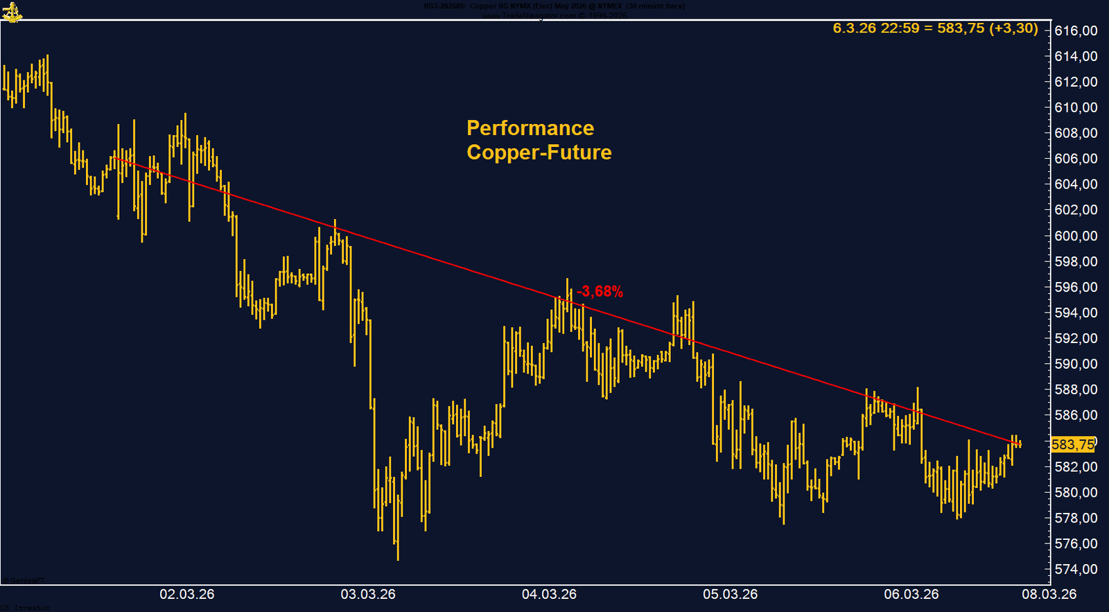 Der Kupfer-Future verliert auf Wochenbasis -3,68%.