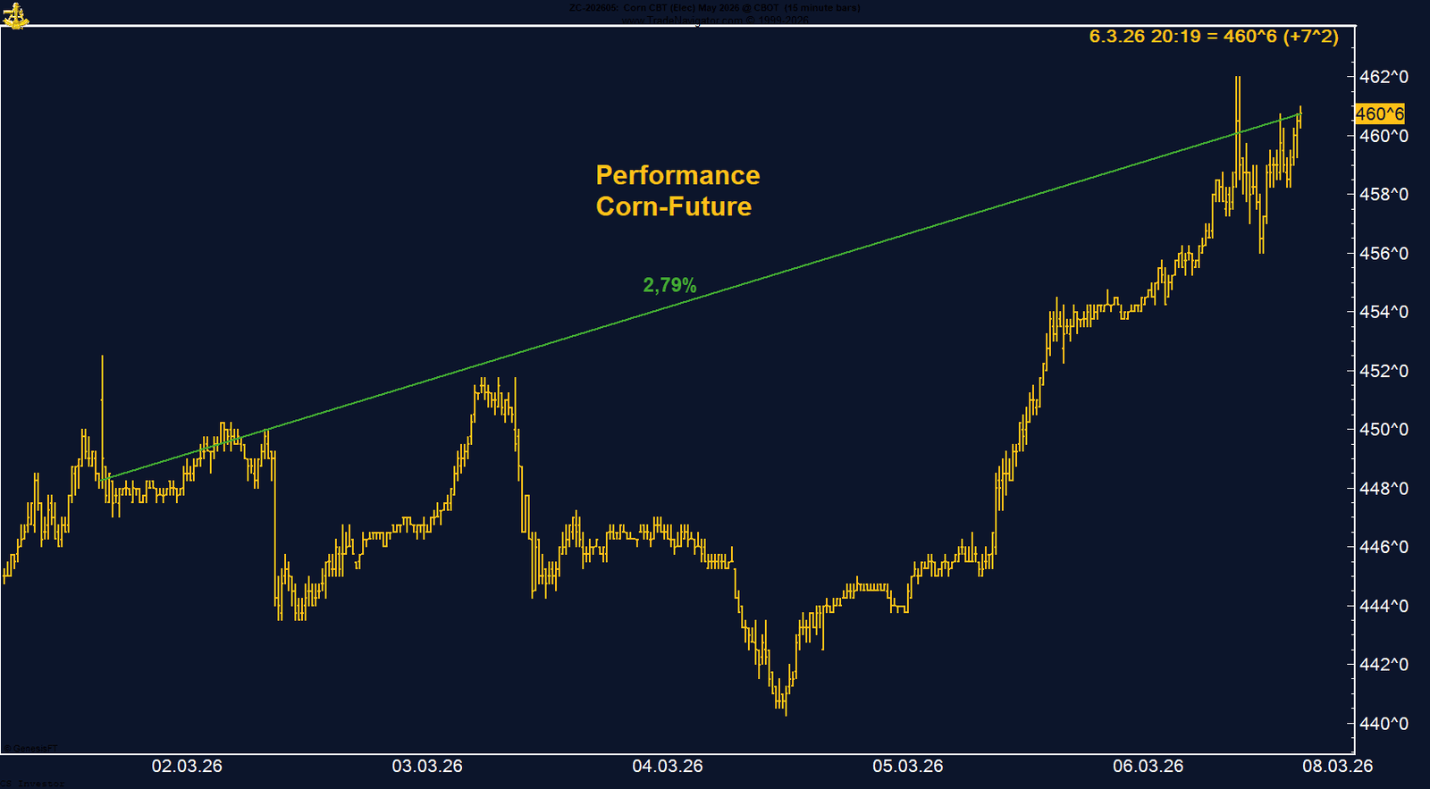 Der Corn-Future an der CBOT zeigte in der vergangenen Woche eine klare Aufwärtsbewegung und legte um 2,79 % zu. Der Kontrakt schloss bei 460,75 US-Cent pro Bushel. Besonders ab dem 4. März gewann der Markt deutlich an Dynamik und setzte eine stabile Aufwärtsbewegung in Gang.