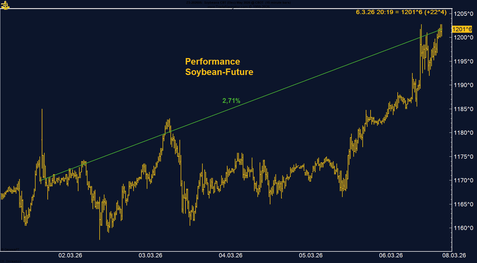 Der Sojabohnen-Future an der CBOT zeigte in der vergangenen Woche eine solide Entwicklung und legte um 2,71 % zu. Der Kontrakt schloss bei 1.201,75 US-Cent pro Bushel und damit oberhalb der psychologisch wichtigen Marke von 1.200 US-Cent. Dieses Niveau markiert zugleich den höchsten Stand seit Mitte 2024 und unterstreicht die aktuell positive Dynamik im Markt.Unterstützung kam zuletzt vor allem aus dem Energiesektor. Der starke Anstieg der Rohölpreise im Zuge der geopolitischen Spannungen im Nahen Osten hat auch die Agrarrohstoffe gestützt. Besonders Sojaöl reagiert sensibel auf steigende Energiepreise, da es eine wichtige Rolle in der Biofuel-Produktion spielt. Diese Verbindung zwischen Energie- und Agrarmärkten sorgt aktuell für zusätzlichen Rückenwind im Sojabohnenkomplex.