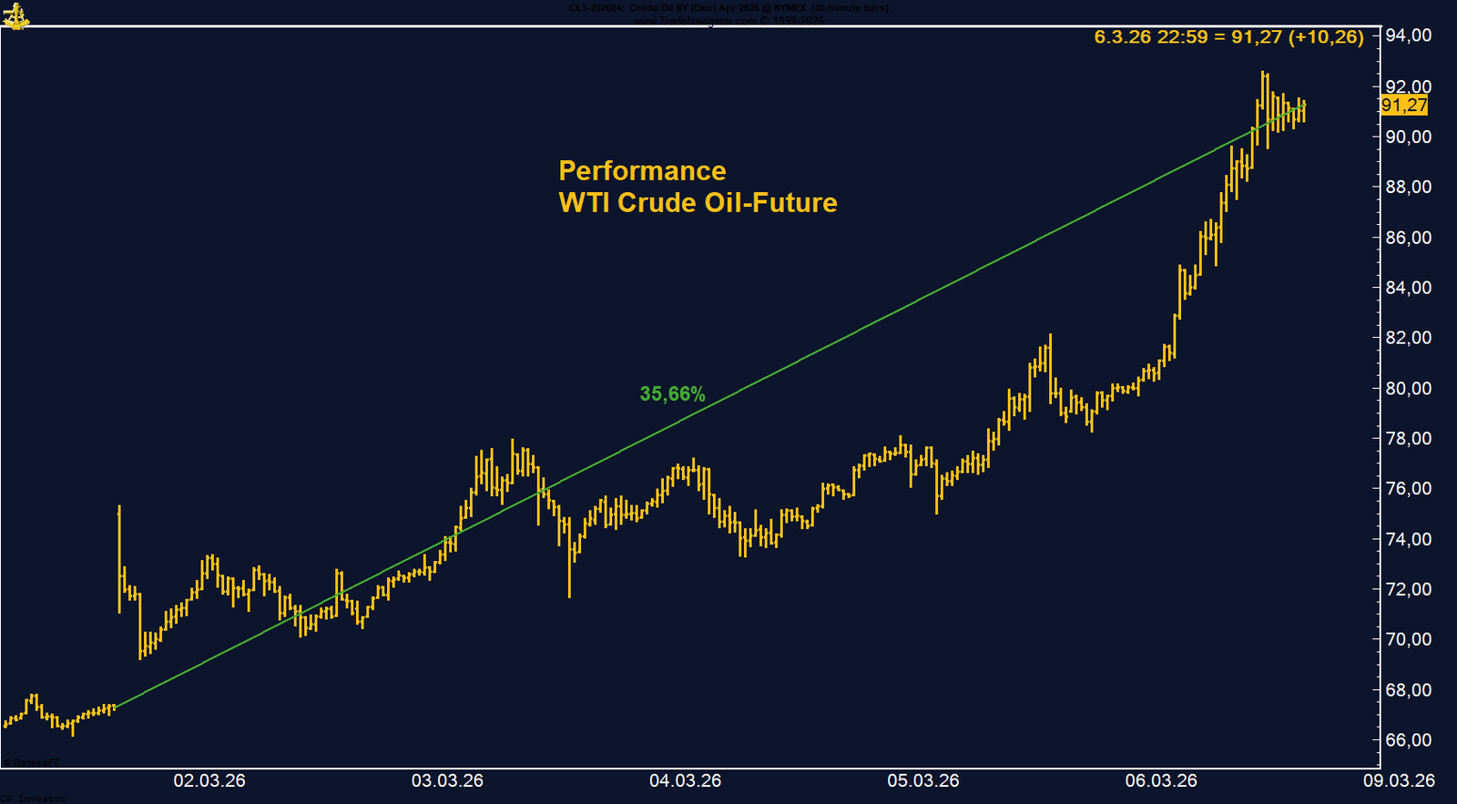 Der WTI Crude Oil Future an der NYMEX zeigte in der vergangenen Woche eine außergewöhnlich starke Bewegung. Der Kontrakt legte um 35,66 % zu und schloss bei 91,27 US-Dollar pro Barrel. Noch zu Beginn der Woche beziehungsweise am vergangenen Freitag notierte der Markt im Bereich von rund 68 US-Dollar, bevor eine massive Rally einsetzte.Auslöser für diesen historischen Preissprung ist die Eskalation des Konflikts im Nahen Osten. Besonders entscheidend für den Ölmarkt ist die Situation rund um die Straße von Hormuz. Dieser Seeweg gilt als eine der wichtigsten Energieadern der Welt, da etwa ein Fünftel der globalen Öltransporte täglich durch diese Meerenge abgewickelt wird. Die aktuellen Berichte deuten darauf hin, dass Tankerverkehr dort erheblich eingeschränkt ist, was unmittelbare Auswirkungen auf das globale Angebot hat.