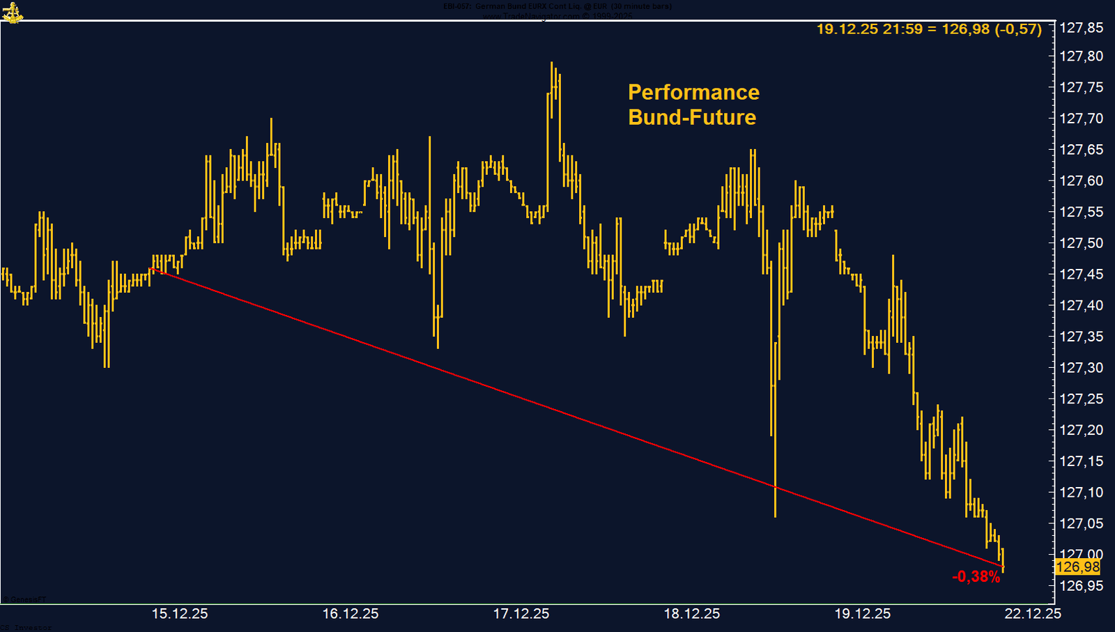 Der Bund-Future leidet aktuell unter einer klaren Kombination aus hawkisher EZB-Interpretation, steigenden Renditen und zunehmender fiskalischer Expansion. Solange sich an dieser Gemengelage nichts ändert, bleibt der Druck auf Staatsanleihen bestehen. Die Bewegung der vergangenen Woche bestätigt das übergeordnete Bild: Renditen nach oben, Bonds unter Druck.
