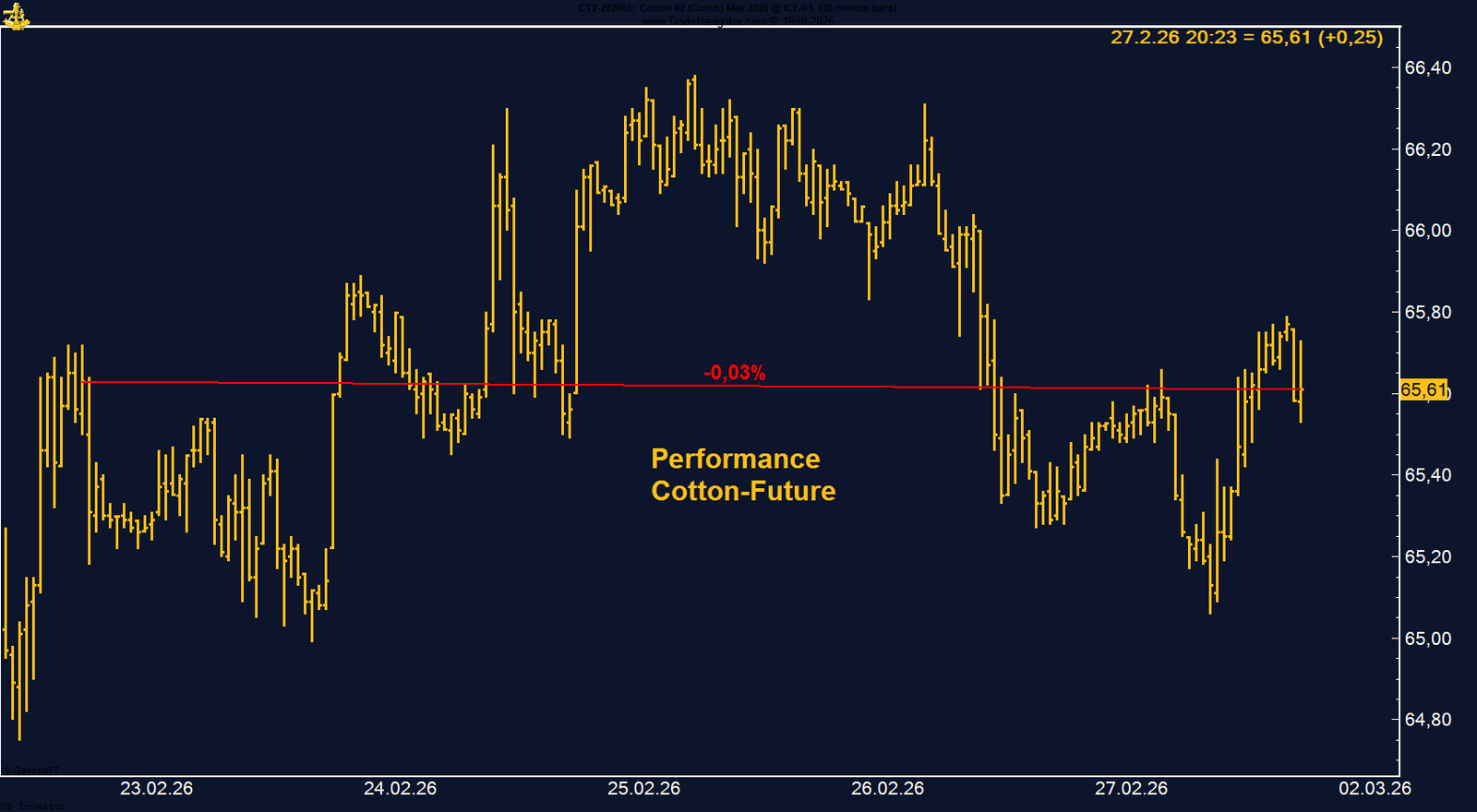 Fundamental bleibt das Bild gemischt. Die Exportverkäufe liegen mit 78 % der USDA-Jahresprojektion unter dem historischen Durchschnitt von 91 %. Gleichzeitig stabilisieren sich die Preise auf internationaler Ebene, der Cotlook A Index konnte zuletzt wieder zulegen. Rohöl als wichtiger Inputfaktor für synthetische Fasern zeigte sich ebenfalls fester, was tendenziell unterstützend wirkt.