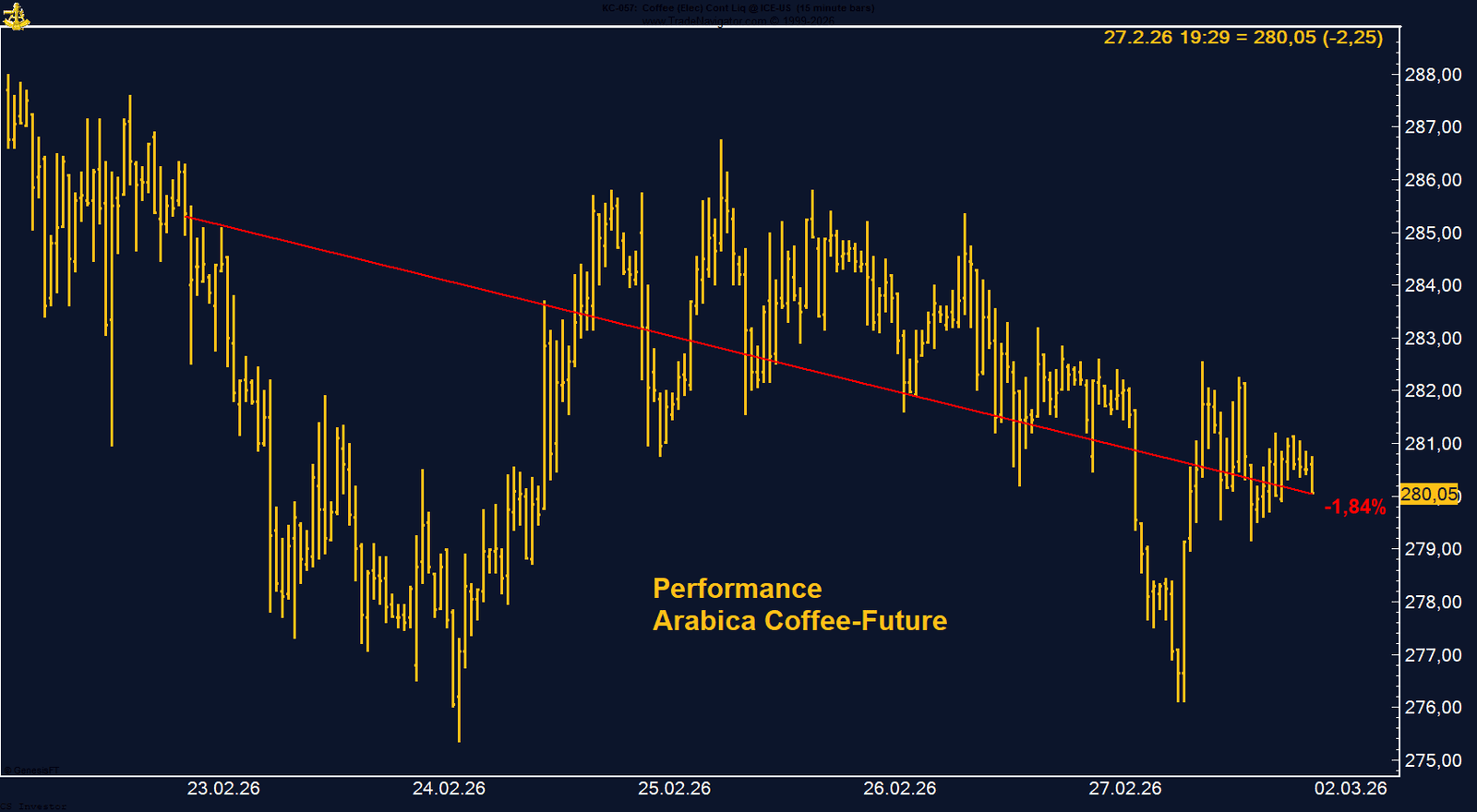 Fundamental belastet vor allem die Aussicht auf eine starke brasilianische Ernte. Prognosen gehen von einer sehr robusten Produktion aus, unterstützt durch günstige Wetterbedingungen in wichtigen Anbauregionen. Gleichzeitig haben sich die Lagerbestände erholt, und hohe Exportmengen – insbesondere aus Vietnam – nehmen zusätzlichen Druck vom Markt. Die Erzählung verschiebt sich damit klar von Knappheit hin zu potenzieller Überversorgung.