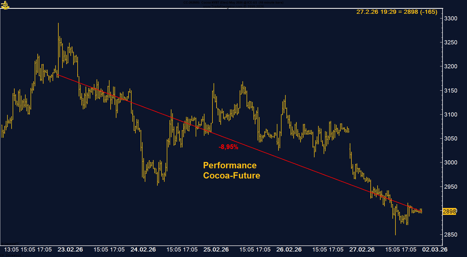 Fundamental dominiert das Überangebots-Narrativ. Prognosen gehen für die kommenden Saisons von deutlichen globalen Überschüssen aus, während sich die Lagerbestände erhöhen und die Ernten in Westafrika robust ausfallen. Gleichzeitig zeigen Grinding-Daten aus Europa und Asien eine spürbare Nachfrageschwäche. Die hohen Schokoladenpreise der vergangenen Jahre wirken dämpfend auf den Konsum, was den Preisdruck zusätzlich verstärkt.