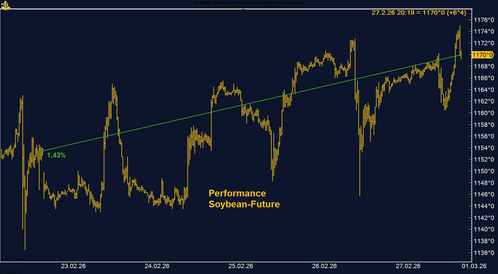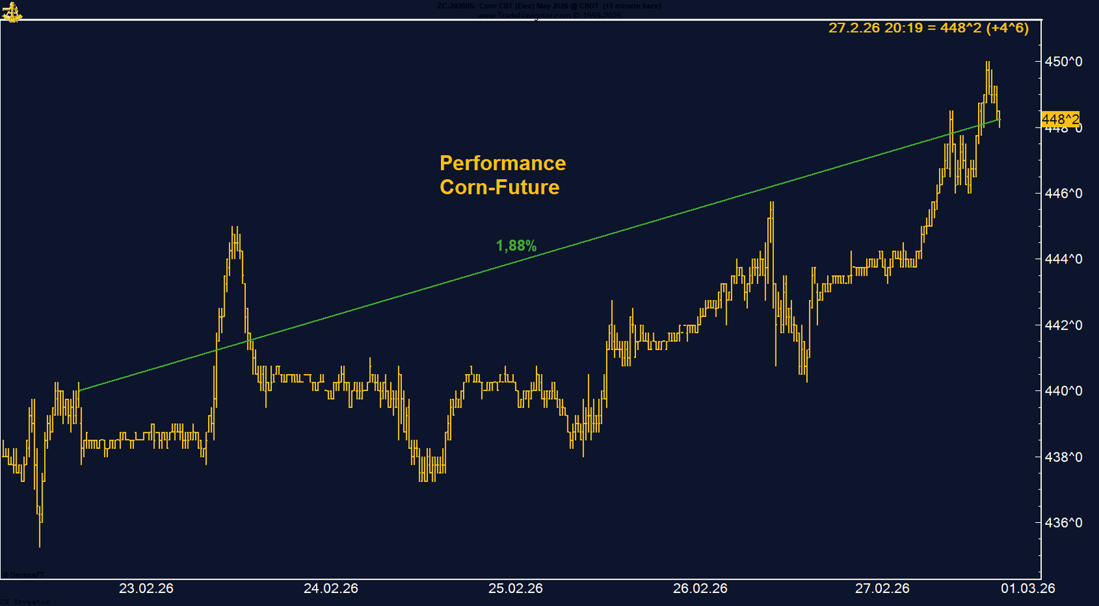 Fundamental erhält Mais Unterstützung durch steigende Rohölpreise. Höhere Energiepreise wirken über den Ethanol-Sektor direkt stützend auf die Maisnachfrage. Zusätzlich sorgten geopolitische Spannungen zuletzt für Short-Covering-Bewegungen im Agrarsektor. Exportdaten bleiben solide, auch wenn sie nicht überdurchschnittlich stark ausfallen.