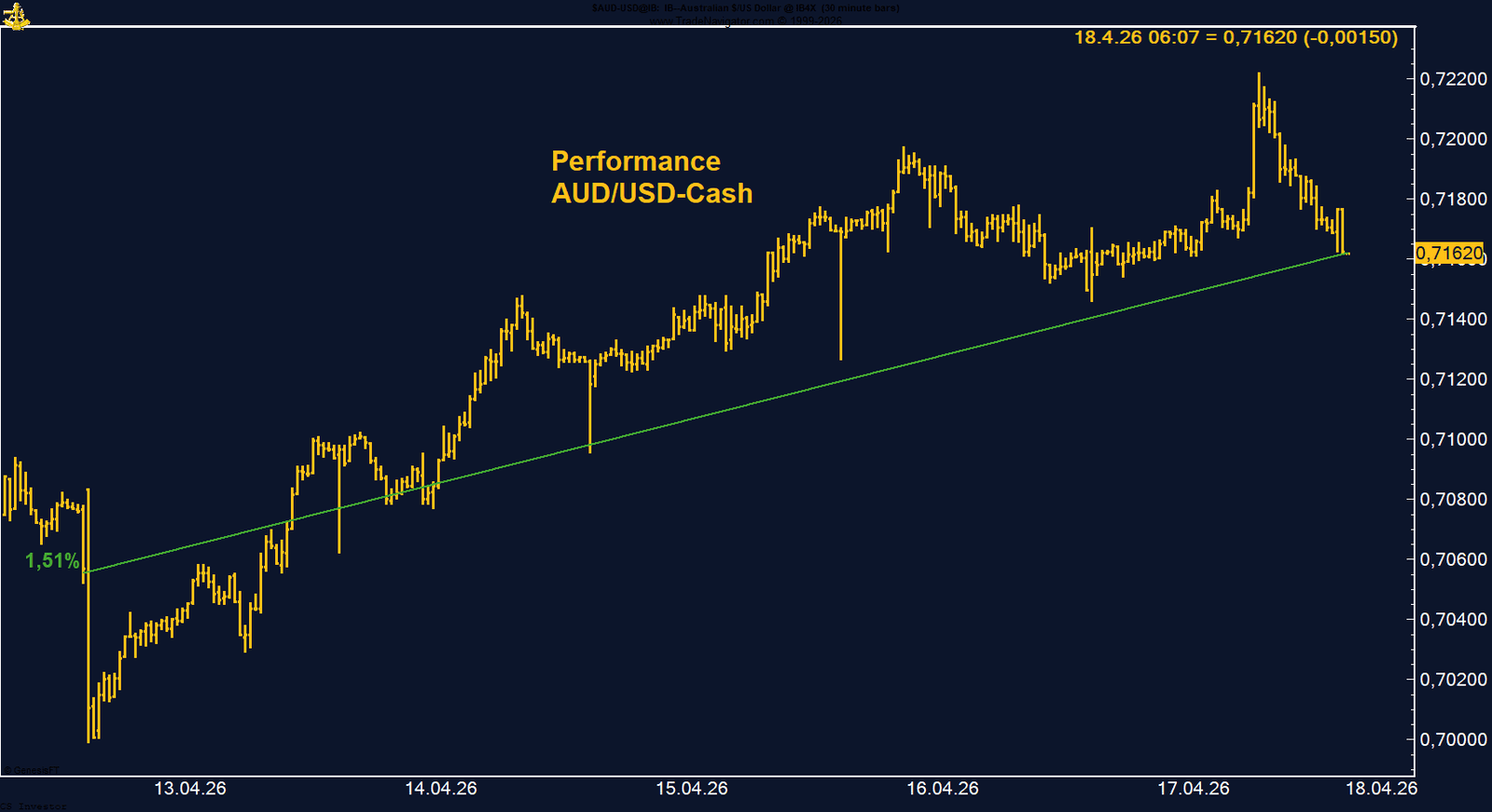 Im Wochenverlauf zeigte sich ein typisches Bild einer starken Trendphase. Nach einer Konsolidierung zu Beginn der Woche oberhalb von 0,70 konnte der Austral-Dollar seine Gewinne schrittweise ausbauen und insbesondere im weiteren Verlauf der Woche an Dynamik gewinnen. Rücksetzer in den Bereich um 0,70 wurden konsequent gekauft, was die Stabilität des Trends unterstreicht.