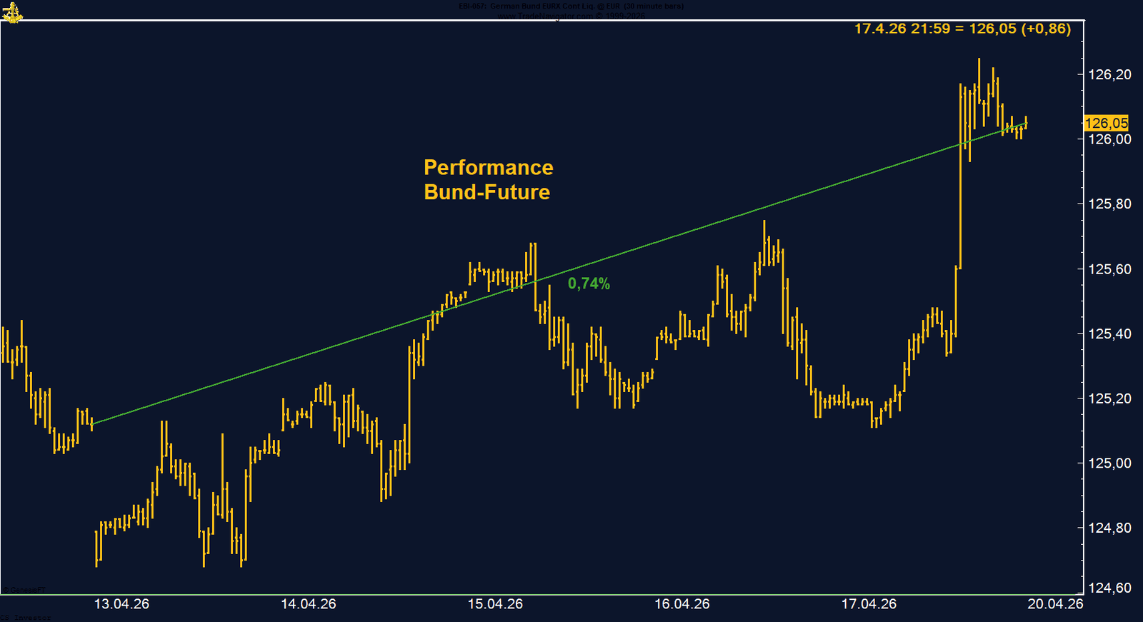 Ausschlaggebend für die positive Wochenentwicklung war insbesondere die Bewegung am Freitag. Der Bund-Future konnte sich im Tagesverlauf dynamisch von Niveaus knapp über 125 Punkten lösen und stieg auf über 126 Punkte an. Der Wochenschluss nahe dem Hoch unterstreicht die Stärke dieser Bewegung und signalisiert kurzfristig erhöhtes Kaufinteresse.