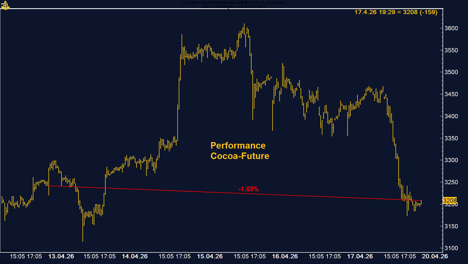 Ein unterstützender Faktor bleibt die Saisonalität. Historisch tendiert der Kakao-Future bis Ende April eher fester, bevor anschließend wieder eine schwächere Phase einsetzt. Damit steht der aktuelle Marktdruck im gewissen Widerspruch zur saisonalen Tendenz.