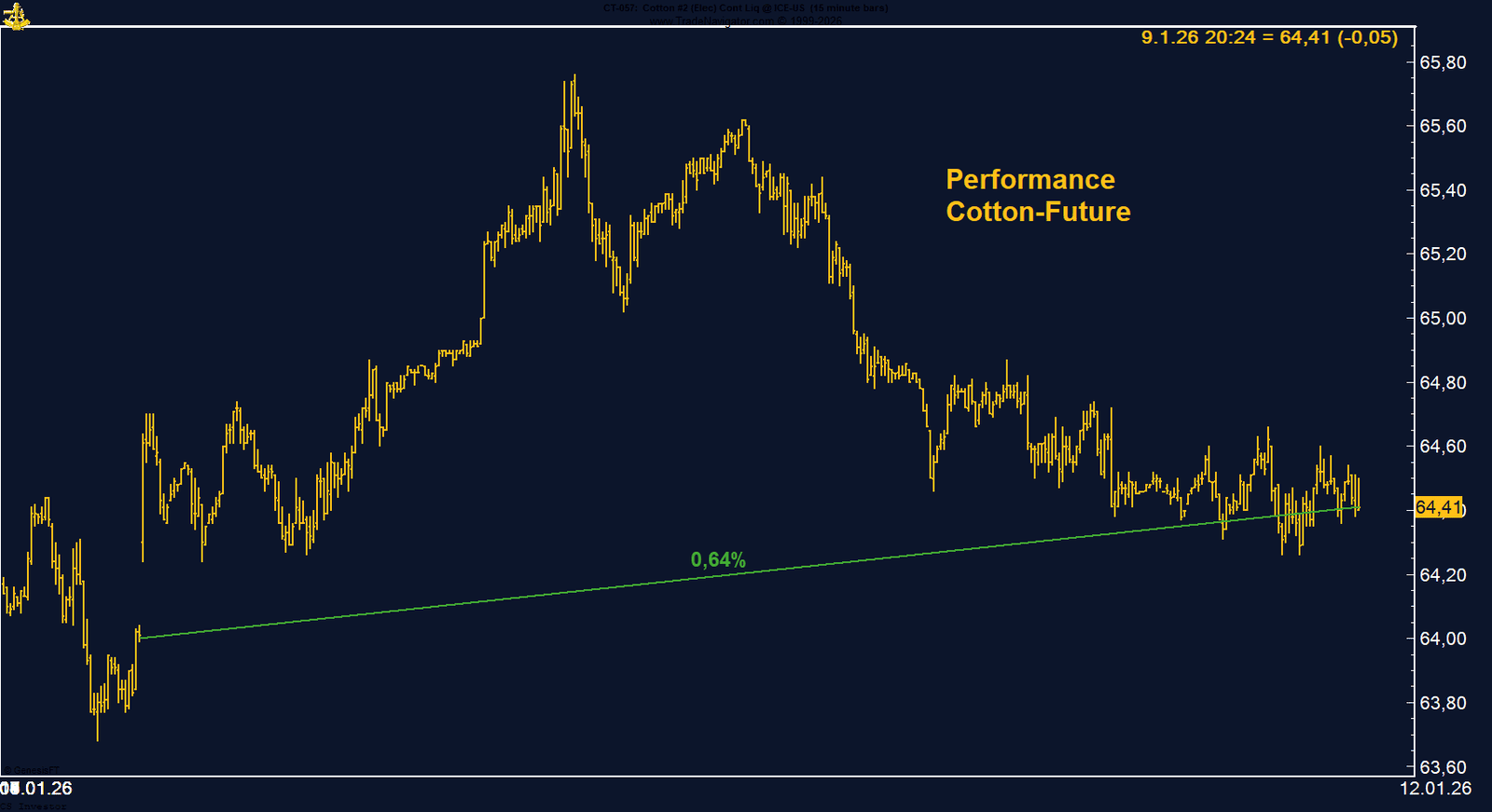 Besonders frustrierend war dabei der Wochenverlauf. Am Dienstag, den 06. Januar, gelang dem Markt zunächst eine saubere Erholung bis auf 65,76 US-Cent. Doch wie schon so oft in den vergangenen Wochen wurde jede Bewegung nach oben konsequent verkauft. Über den restlichen Wochenverlauf setzte sich wieder schrittweise Verkaufsdruck durch, sodass der Kontrakt letztlich nahe dem unteren Bereich der Wochenrange schloss. Baumwolle kommt derzeit schlicht nicht in die Gänge.
