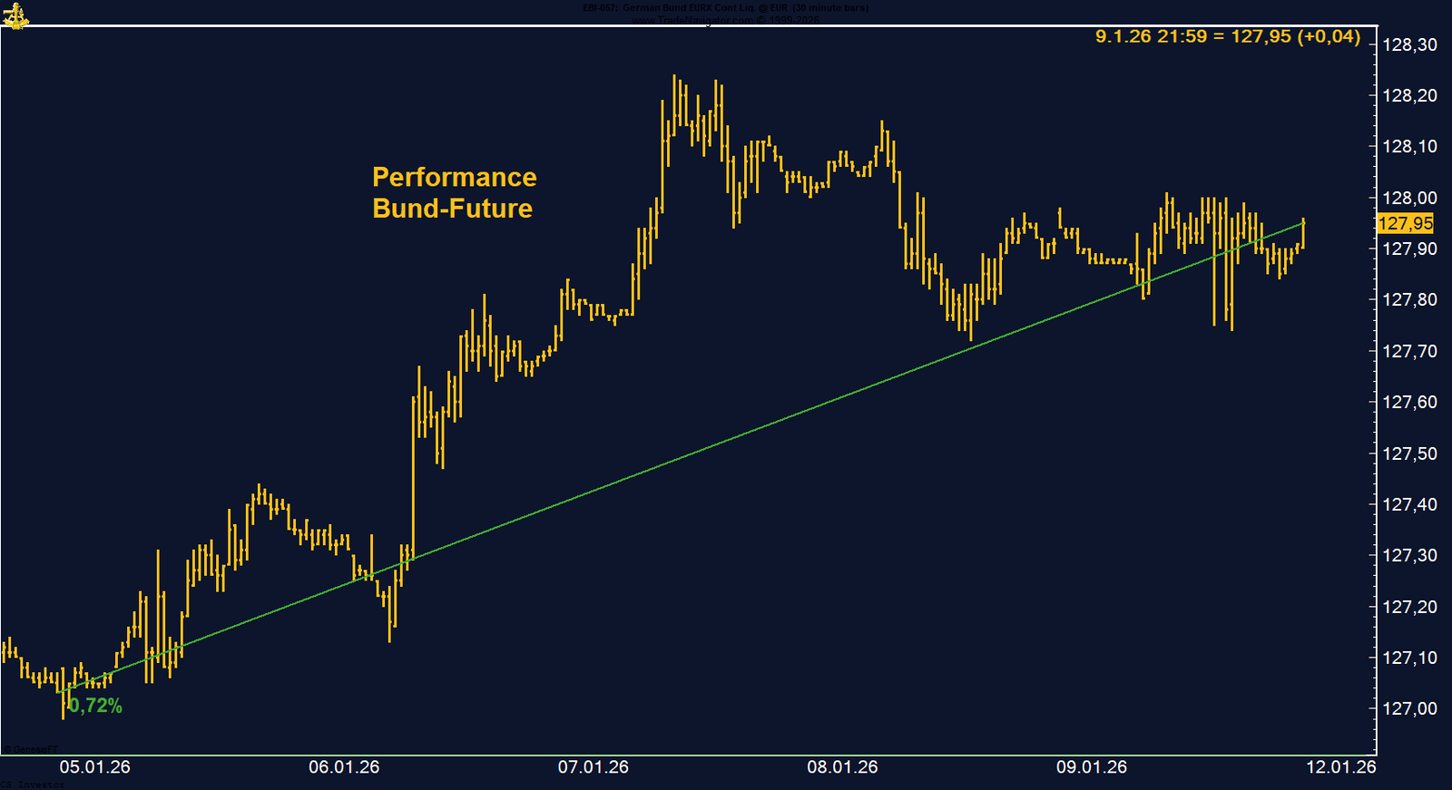 Parallel dazu zogen die Renditen der 10-jährigen Bundesanleihe in den ersten Januartagen wieder an und bewegten sich zum Wochenschluss bei 2,82–2,83 %, nachdem sie zuvor auf ein knapp einmonatiges Tief gefallen waren. Steigende Renditen wirkten entsprechend dämpfend auf den Bund Future. Ein neuer Abwärtstrend entstand daraus jedoch nicht – vielmehr handelt es sich bislang um einen Seitwärts- bis Konsolidierungsprozess auf dem Niveau von Ende 2025.