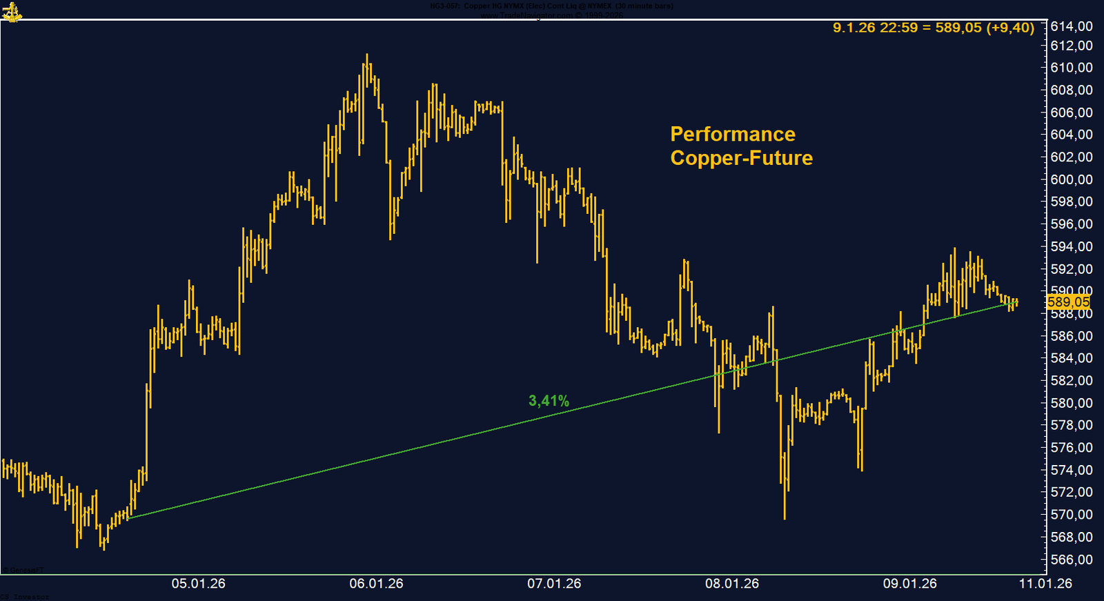 Am Dienstag, dem 6. Januar, markierte der Kupfer-Future an der CME/COMEX ein neues Allzeithoch bei 611,25 US-Cent. Parallel dazu erreichte auch der Londoner Kupfer-Future an der LME ein neues Rekordhoch. Dass beide Leitkontrakte nahezu zeitgleich neue Höchststände ausbildeten, unterstreicht die Breite und Qualität der Bewegung.