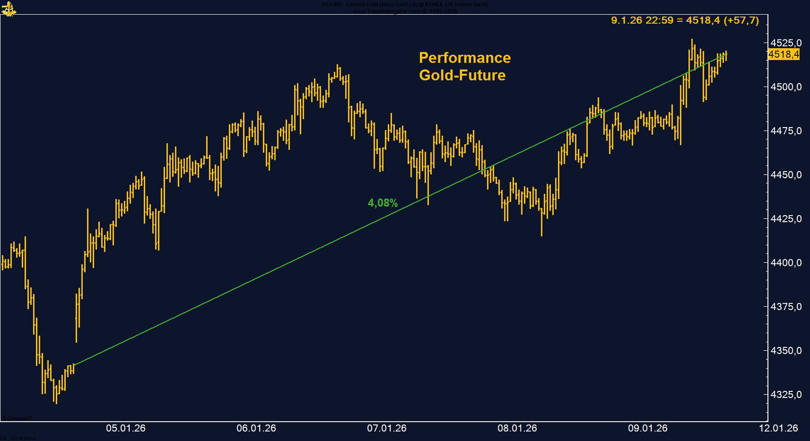 Der Gold-Future legte in der vergangenen Handelswoche deutlich zu und gewann +4,08 %. Der Kontrakt schloss bei 4.518,4 USD je Unze und damit nahe dem Wochenhoch, das bei 4.527 USD lag. Die Preisentwicklung war über die Woche hinweg klar konstruktiv, Rücksetzer wurden konsequent gekauft. Technisch bleibt das Momentum eindeutig auf der Oberseite.