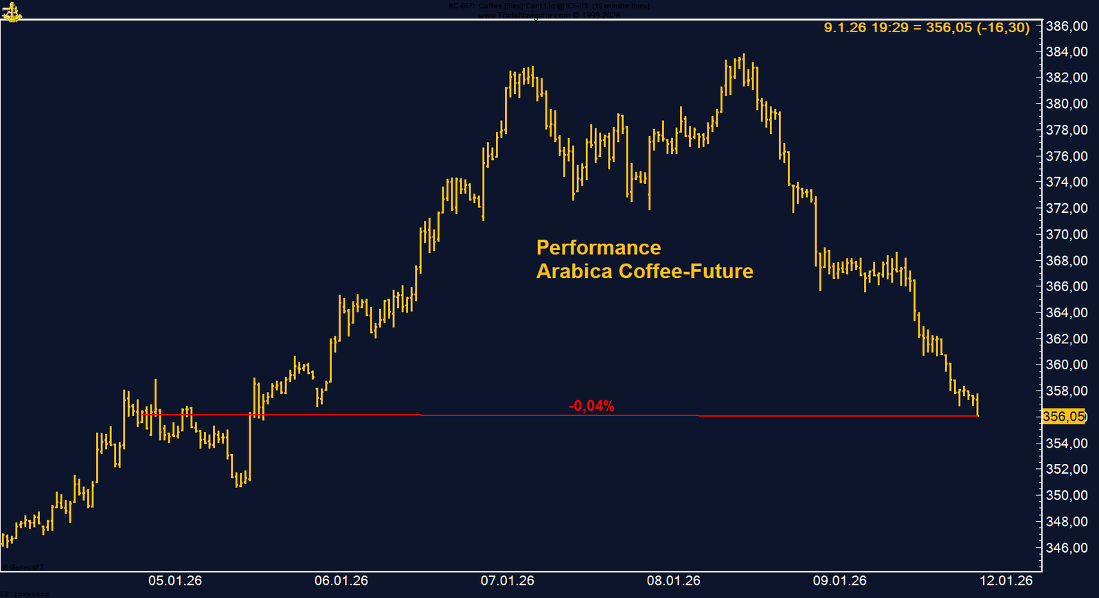 Das charttechnische Bild bleibt damit frustrierend: Seit dem All-Time-High vom 23. Oktober 2025 liegt Arabica weiterhin rund −18,7 % unter diesem Spitzenstand – der Markt hat bislang keine überzeugende Trendwende vollzogen.