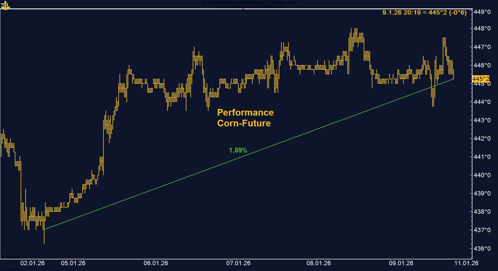Der Corn-Future (CBOT) konnte in der vergangenen Handelswoche um +1,89 % zulegen und schloss bei 445,25 US-Cent. Der Großteil der Bewegung erfolgte bereits zu Wochenbeginn: Gleich am Montag setzte der Markt zu einem Anstieg an, danach verlief der Handel überwiegend ruhig und seitwärts. Zum Wochenschluss zeigte sich der Markt stabil, ohne größere Abgabedynamik.