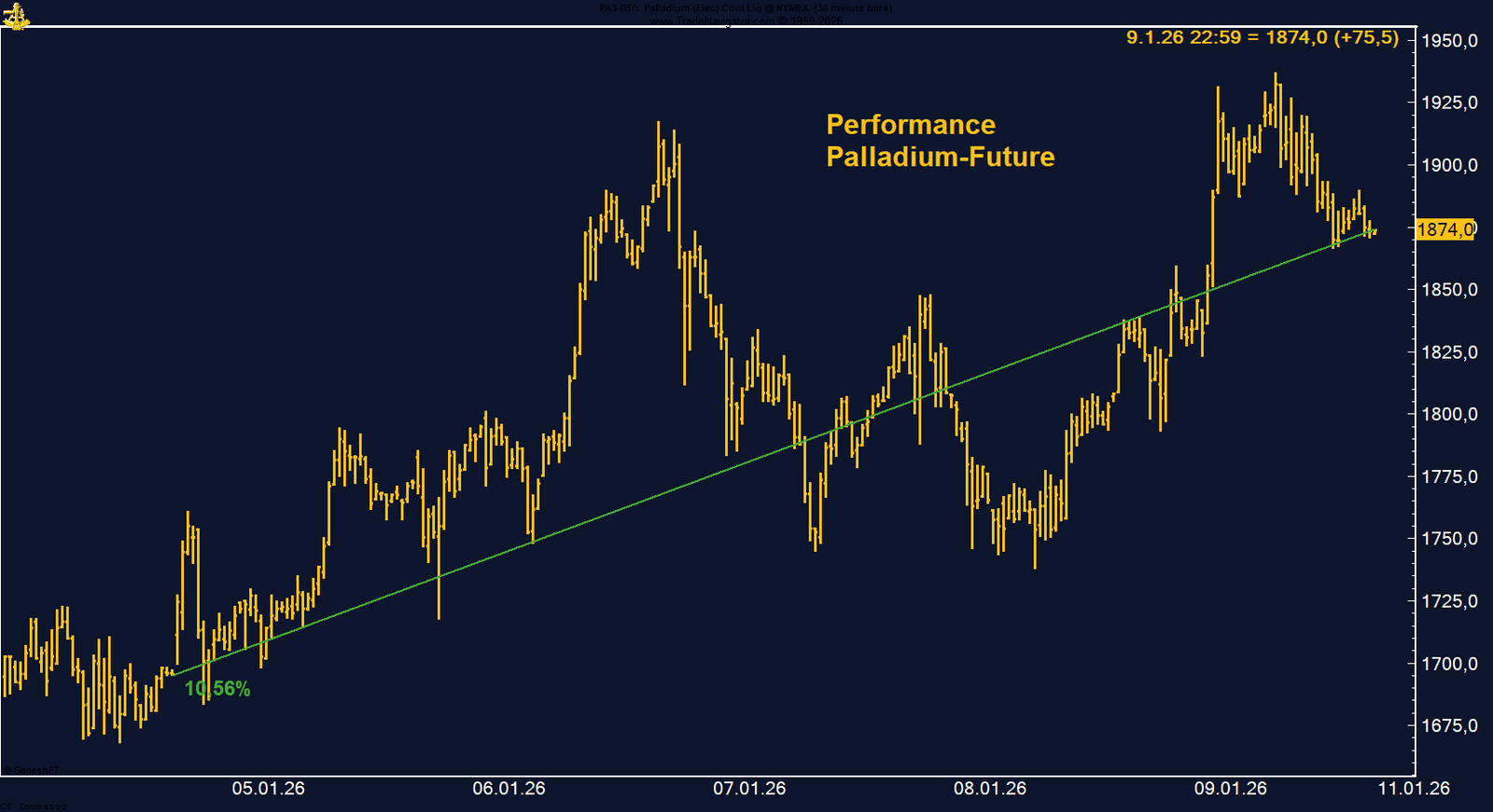 Der Palladium-Future an der NYMEX zeigte in der vergangenen Woche eine sehr starke Performance und legte um +10,56 % zu. Der Kontrakt schloss bei 1.874 USD je Unze, nachdem im Wochenverlauf sogar ein Hoch bei 1.937 USD erreicht wurde. Trotz zwischenzeitlicher Rücksetzer konnte ein Großteil der Gewinne gehalten werden. Die zuletzt angekündigten Margin-Erhöhungen wurden vom Markt insgesamt gut absorbiert, auch wenn die Volatilität hoch blieb – ein Muster, das derzeit in nahezu allen Edel- und Industriemetallen zu beobachten ist.