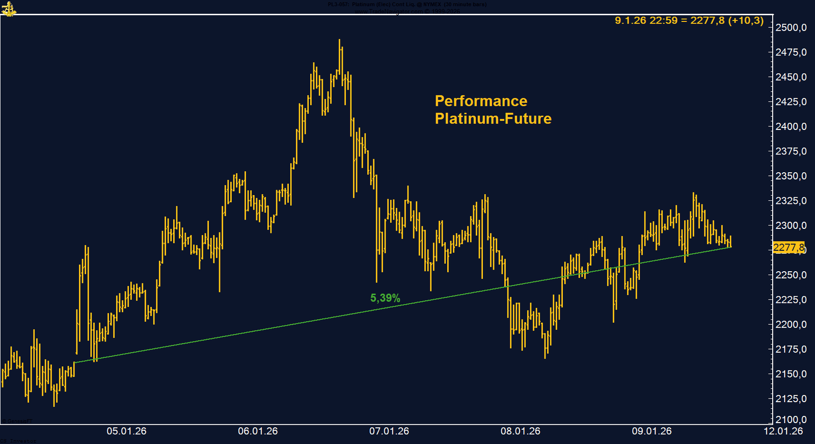 Der Platin-Future zeigte in der vergangenen Handelswoche eine kräftige Aufwärtsbewegung und schloss mit einem Wochenplus von +5,39 % bei 2.277,80 USD je Unze. Der Markt entwickelte sich zunächst sehr dynamisch und konnte bis Mittwoch, den 07.01., auf ein Wochenhoch von 2.487,80 USD ansteigen. Dieses Niveau erwies sich jedoch als nicht nachhaltig, sodass es im weiteren Wochenverlauf zu Gewinnmitnahmen kam. In einem insgesamt sehr volatilen Metallumfeld – ähnlich wie bei Gold, Silber und Palladium – blieb Platin trotz der Korrektur klar im Plus.