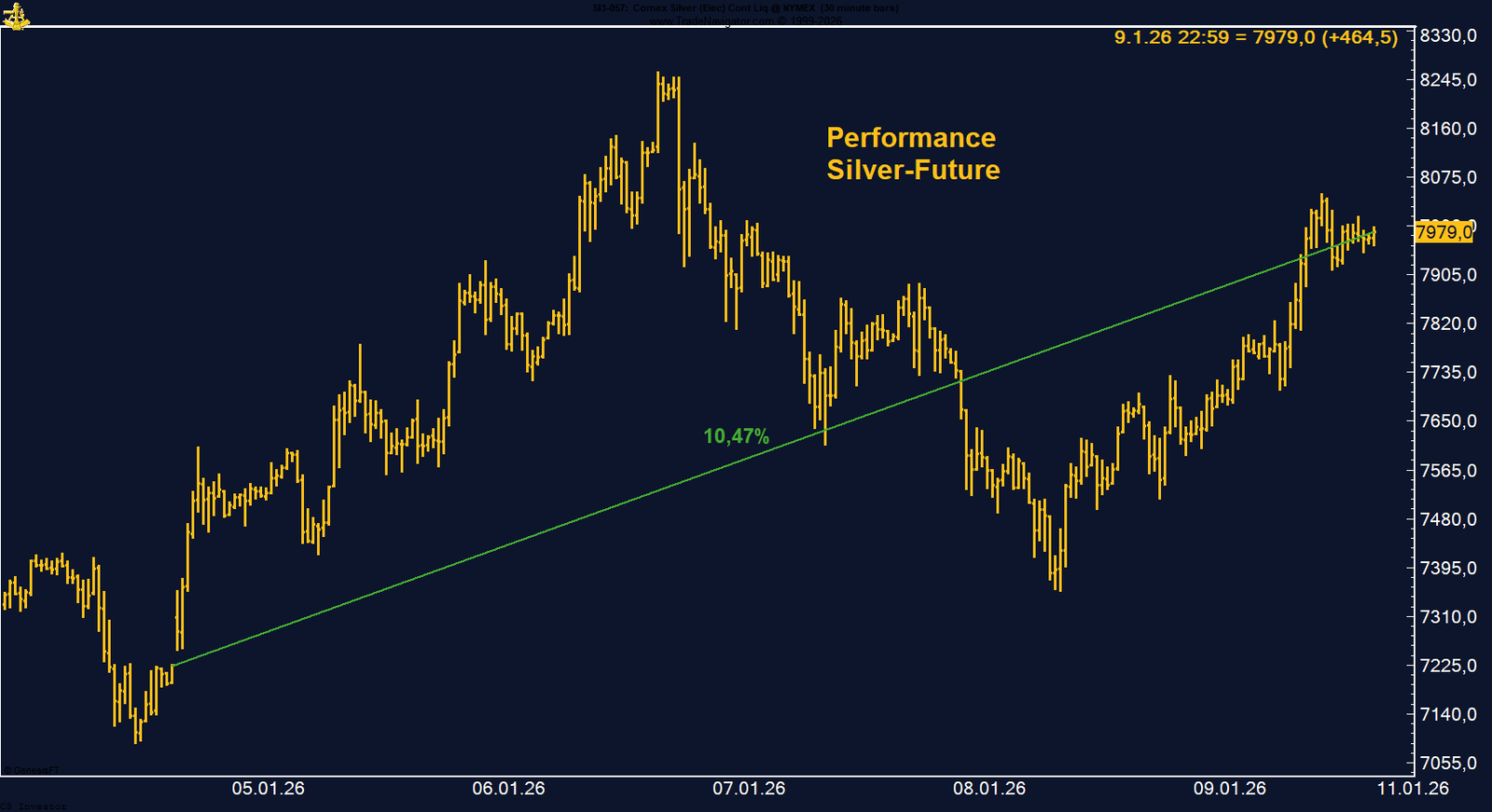 Der Silver-Future erlebte in der vergangenen Handelswoche eine extrem volatile, unter dem Strich jedoch sehr starke Bewegung. Auf Wochenbasis legte Silber um +10,47 % zu und schloss bei 79,79 US-Dollar je Unze. Während der Woche war die Schwankungsbreite erheblich: Bereits am Mittwoch stieg der Kontrakt bis auf 82,58 US-Dollar, was zeitweise einem Wochenplus von rund 14 % entsprach. Dieses Niveau konnte jedoch nicht gehalten werden. Nach deutlichen Abgaben bis Donnerstag setzte zum Wochenausklang erneut eine Erholung ein.