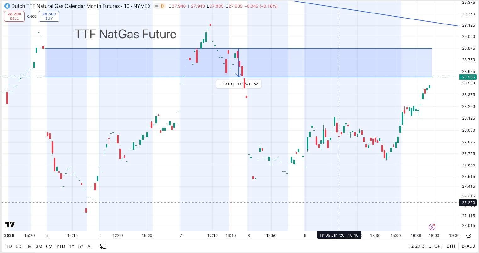 Der TTF Natural Gas Future setzte seine Seitwärts-bis-Abwärtsbewegung in der vergangenen Handelswoche fort und verlor auf Wochenbasis −1,07 %, mit einem Wochenschluss bei 28,565 EUR/MWh. Auf den ersten Blick ein unspektakulärer Verlauf – auf den zweiten Blick jedoch zunehmend bemerkenswert, da sich die fundamentale Lage weiter zuspitzt.