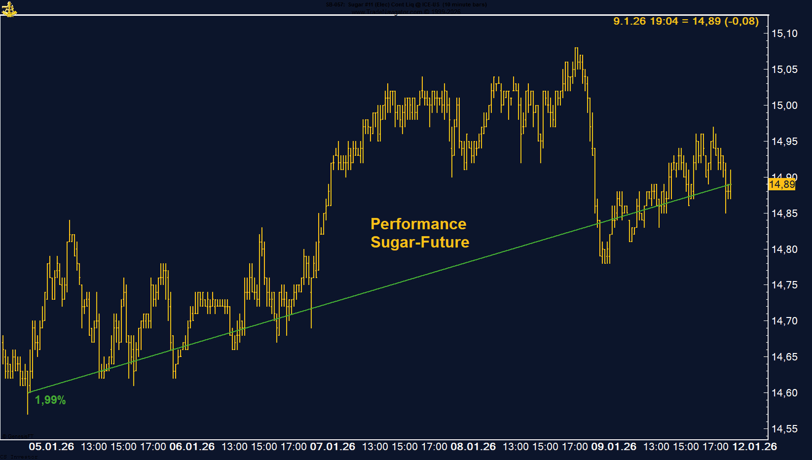 Saisonal betrachtet ist das Umfeld kurzfristig nicht schlecht. Der Zucker-Future hat statistisch bis Ende Januar Aufwärtspotenzial, gefolgt von einer möglichen Korrektur und einer weiteren Erholungsphase bis Ende Februar.