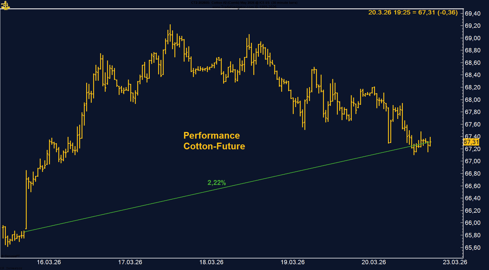 Auch technisch zeigt sich der Markt stabilisiert. Nach dem mehrmonatigen Abwärtstrend konnte sich Baumwolle zuletzt klar nach oben absetzen und befindet sich aktuell in einer Phase erhöhter Aufmerksamkeit seitens der Marktteilnehmer. Gleichzeitig deutet die saisonale Struktur derzeit eher auf eine Phase seitwärts gerichteter Preisbewegungen hin. Dies spricht dafür, dass nach der jüngsten Rally zunächst Konsolidierungstendenzen auftreten könnten.
