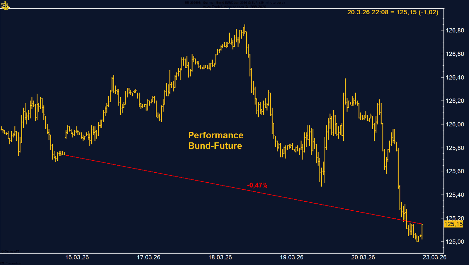 Die Marktstruktur bleibt damit klar renditegetrieben. Solange sich die Erwartungen an eine restriktivere Geldpolitik in der Eurozone halten und gleichzeitig Inflationsrisiken durch höhere Energiepreise bestehen bleiben, dürfte der Bund-Future anfällig für weitere Rücksetzer bleiben. Zwar kann es im Bereich um 125 Punkte zu temporären Gegenbewegungen kommen, doch diese ändern aktuell nichts am übergeordneten Abwärtstrend.