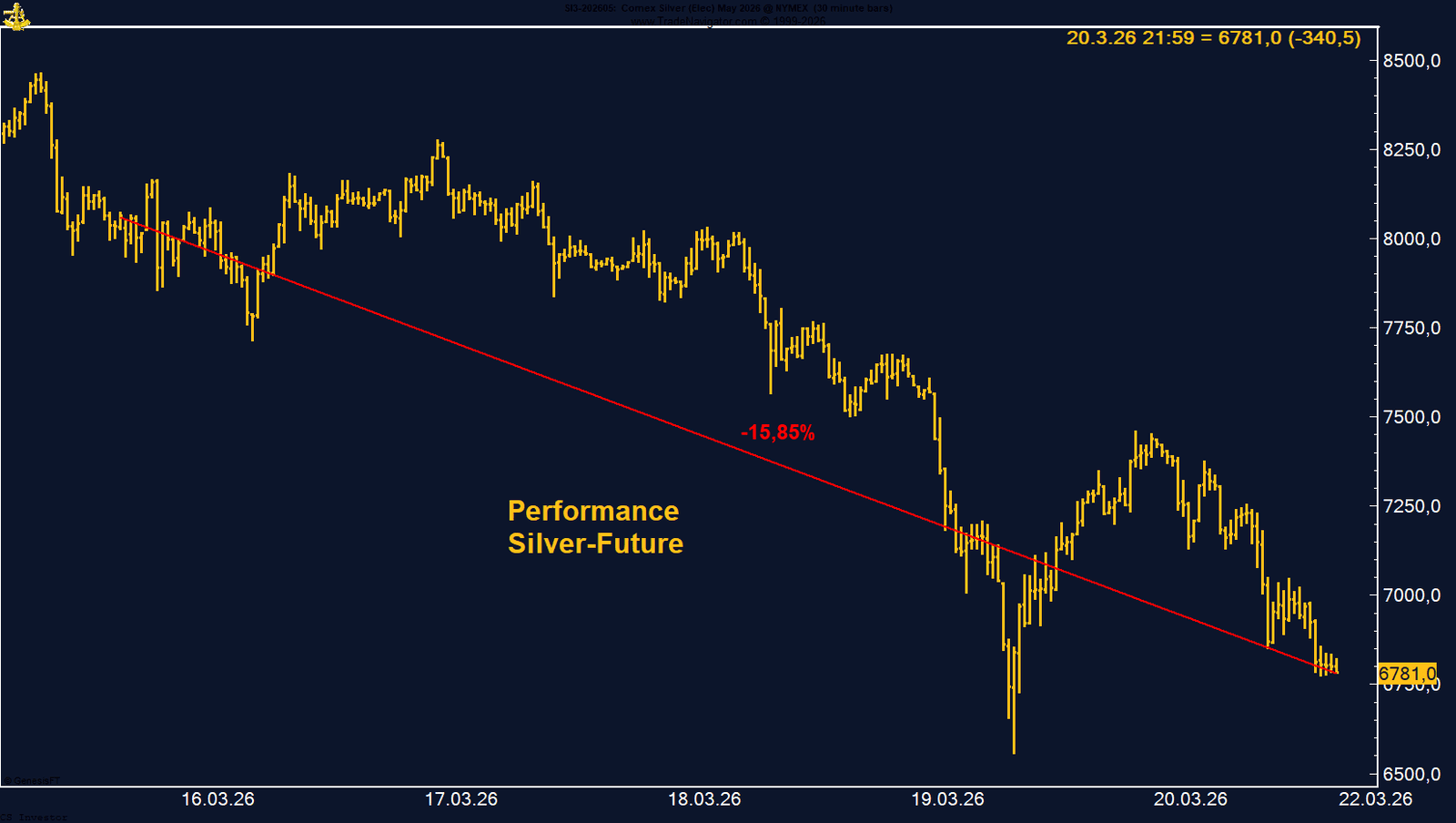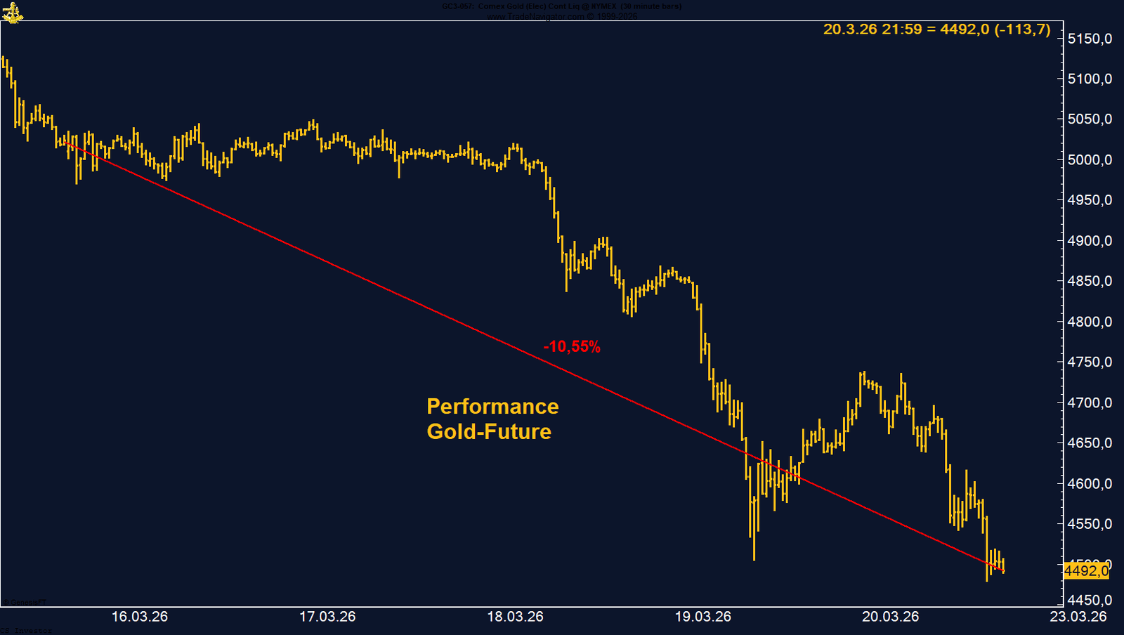 Auslöser der starken Abgaben war vor allem die deutliche Neubewertung der Zinsentwicklung in den USA. Steigende Energiepreise infolge der geopolitischen Eskalation im Nahen Osten haben die Inflationserwartungen nach oben getrieben und gleichzeitig die Aussicht auf rasche Zinssenkungen deutlich reduziert. In diesem Umfeld geraten unverzinsliche Anlagen wie Gold unter Druck, während steigende Anleiherenditen zusätzliche Verkaufsimpulse liefern.