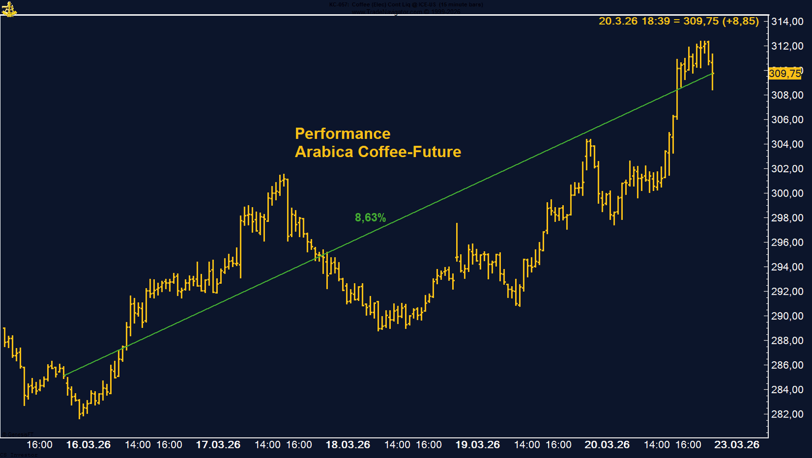 Fundamental bleibt der Kaffeemarkt von kurzfristigen Angebotsfaktoren geprägt. Hinweise auf geringere Exportmengen aus Brasilien sowie eine zurückhaltende Verkaufsbereitschaft der Produzenten stützen aktuell die Preise. Gleichzeitig sorgen geopolitische Unsicherheiten und steigende Transportkosten für zusätzliche Unterstützung auf der Nachfrageseite.