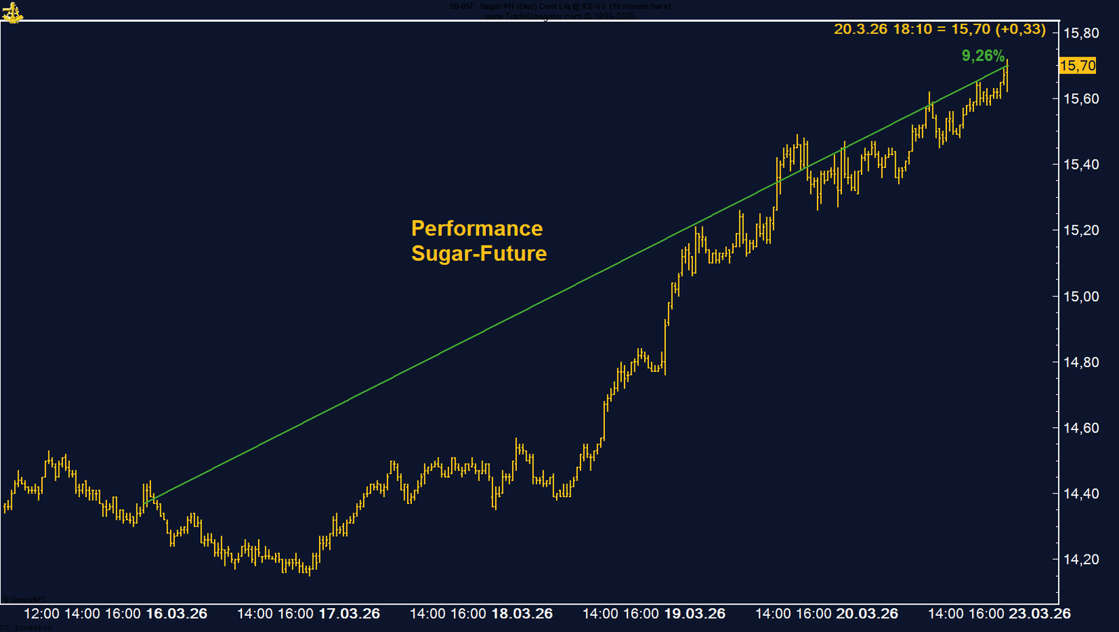 Fundamental wurde der Markt zusätzlich durch steigende Energiepreise unterstützt. Höhere Benzin- und Ethanolpreise erhöhen die Attraktivität der Zuckerrohrverarbeitung zu Ethanol, was potenziell das Angebot an Zucker verknappen kann. Gleichzeitig bleibt die globale Versorgungslage durch erwartete Überschüsse mittelfristig ein belastender Faktor.