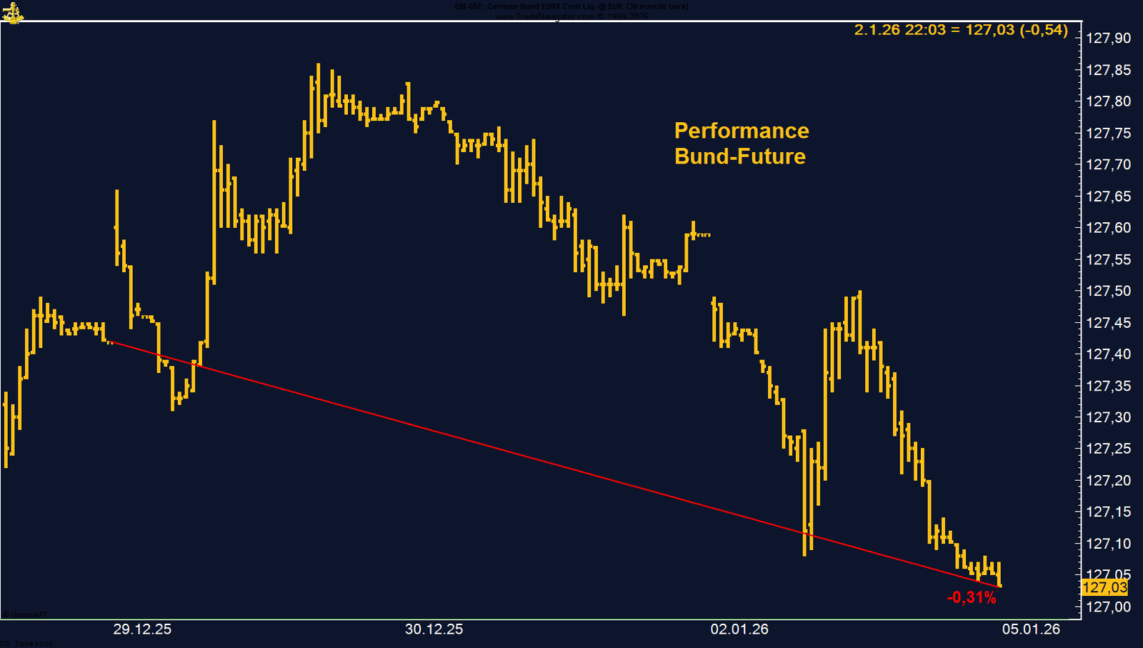 Der Euro-Bund-Future steht weiter unter Druck. Steigende Renditen, hohe Emissionen und ein Umfeld dauerhaft höherer Zinsen belasten die Kursentwicklung. Der schwache Wochenschluss bestätigt die negative Struktur – erst eine klare Entspannung auf der Angebots- oder Zinsseite würde das Bild nachhaltig aufhellen.