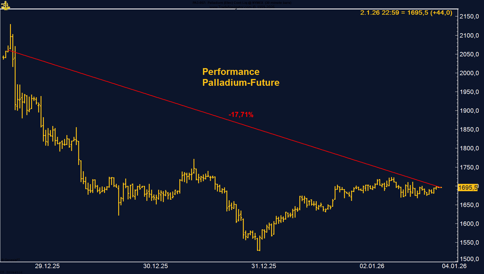 Der jüngste Einbruch bei Palladium war heftig und primär margingetrieben, nicht fundamental ausgelöst. Trotz der hohen Volatilität bleiben Jahresperformance, saisonales Muster und erste Long-Positionen auf spekulativer Seite konstruktive Faktoren. Nach dem scharfen Reset ist Palladium wieder ein Markt, der genau beobachtet werden sollte – insbesondere mit Blick auf eine mögliche Erholung in der saisonal starken Phase bis ins Frühjahr.