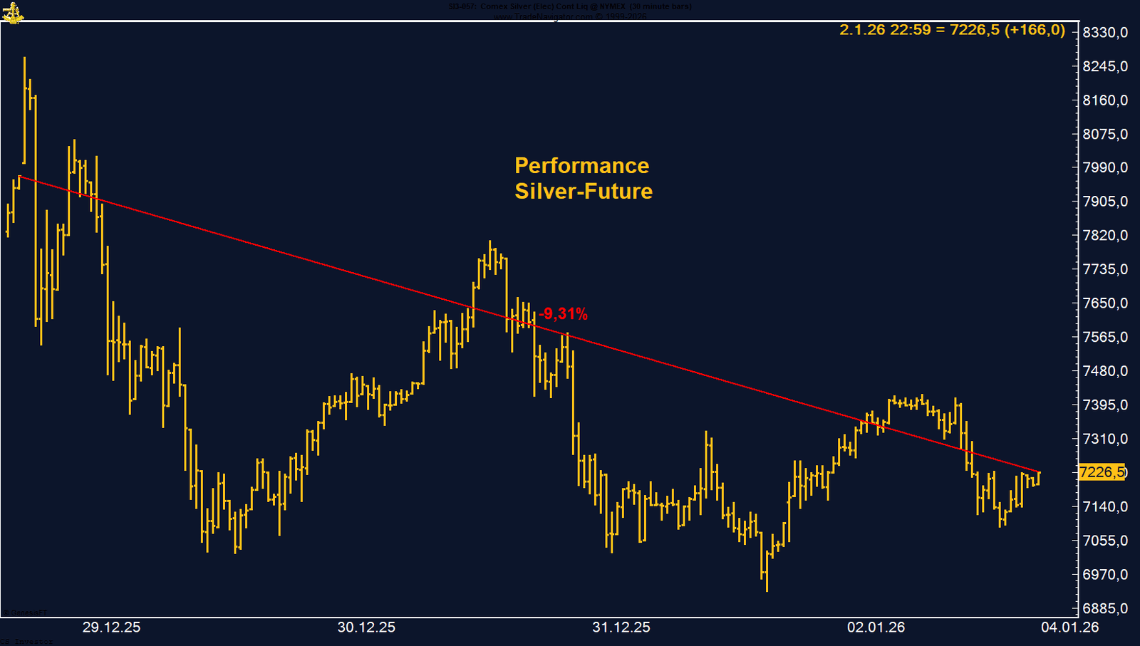 Klarer Rücksetzer nach Überhitzung, verstärkt durch Margin-Erhöhungen. Keine Kapitulation im Managed Money – Struktur bleibt intakt.