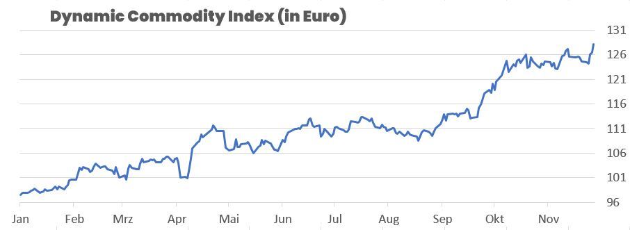 Der DCX hat in der vergangenen Woche deutlich an Stärke gewonnen und ist um +2,75 % auf 128,08 Punkte gestiegen. Damit erhöht sich die Performance seit Jahresbeginn auf +29,53 % – getragen von einer breiten Erholung im Metallkomplex, stabilen Währungs- und Energietrends sowie einer zunehmend konstruktiven Dynamik in den Agrarmärkten. Besonders auffällig war die starke Bewegung in Silber, Platin und Palladium, aber auch Kupfer, Mais und Kaffee haben das Gesamtbild spürbar unterstützt. Trotz einer verkürzten Handelswoche in den USA zeigte der Index eine klare Trendstärke, die in mehreren Segmenten nun in die saisonal stärkste Phase des Jahres übergeht.