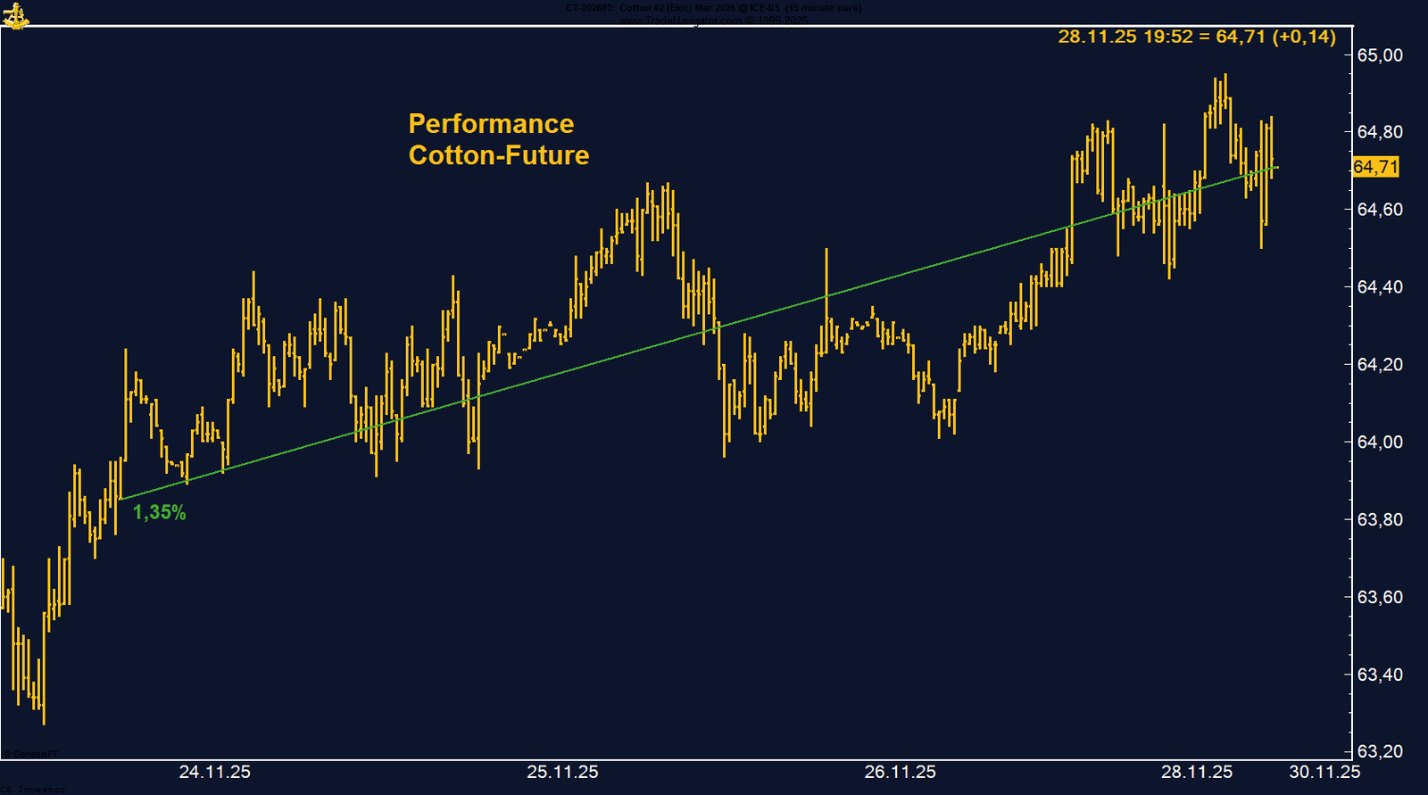 Baumwolle präsentiert sich zum Jahresende in einem attraktiven, asymmetrischen Setup. Die Kombination aus einer historisch starken Saisonalität, stabilen Fundamentaldaten und einer großen spekulativen Short-Position schafft einen konstruktiven Hintergrund. Der Markt muss nicht viel tun, um zusätzlichen Druck auf die Shorts aufzubauen – und die Preisaktivität der letzten Woche zeigt, dass erste Käufer bereits aktiv werden. Stabilisiert sich Baumwolle oberhalb von 64 US-Cent, könnte der Markt in den kommenden Wochen in eine dynamischere Aufwärtsphase eintreten.