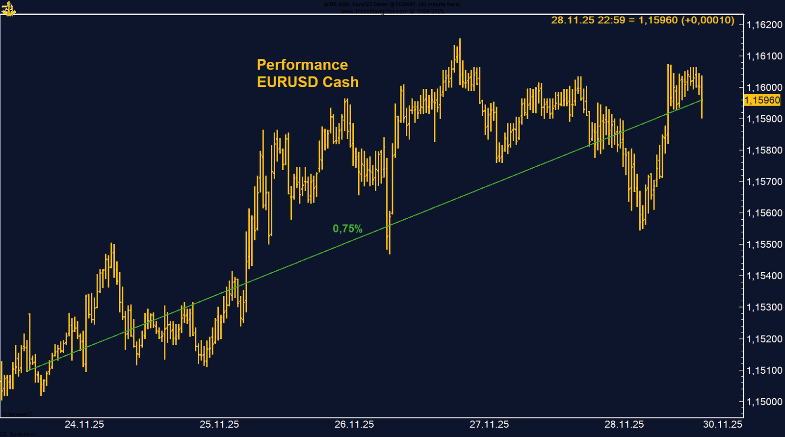 Solider Anstieg Richtung 1,16. Markt preist Zinssenkung zu 86 % ein – klare makroökonomische Unterstützung. Positionierung konstruktiv.