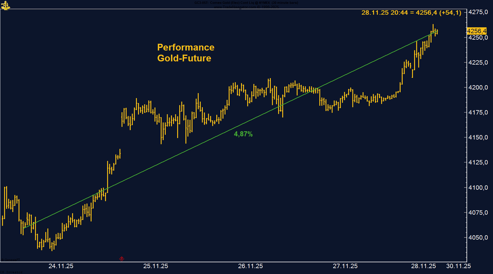 Gold befindet sich fest im Griff einer Jahresendrallye und profitiert von einem idealen Umfeld aus fallenden Realrenditen, hoher institutioneller Nachfrage und einem überzeugenden saisonalen Muster. Solange die Zinssenkungserwartungen hoch bleiben und der Bereich um 4.180 USD hält, spricht alles für weiter steigende Kurse bis zum Jahresende.