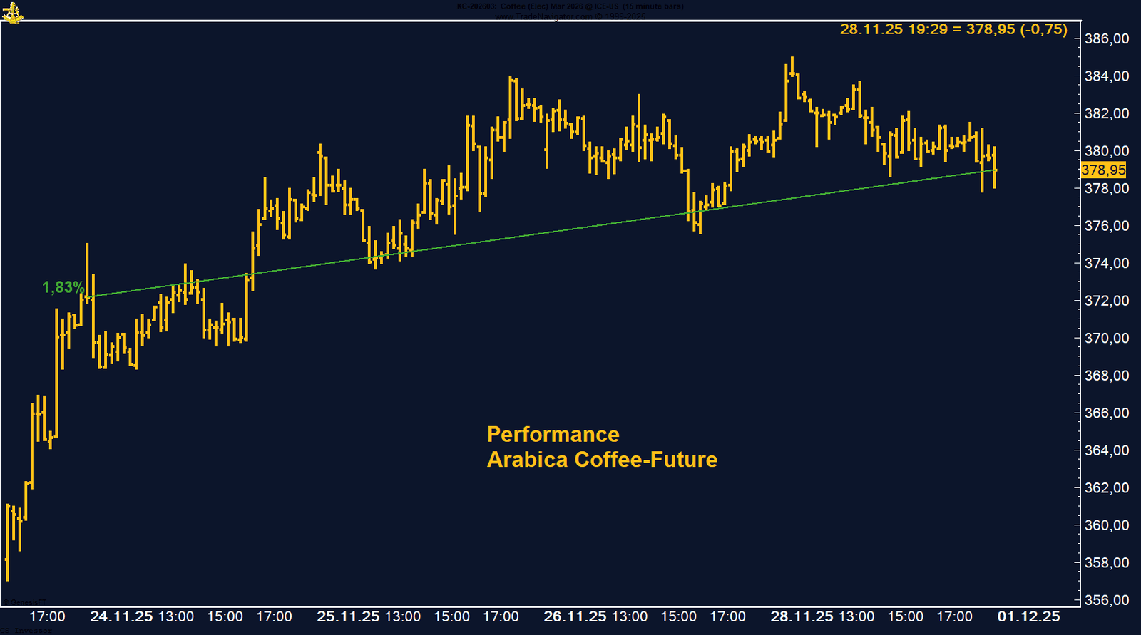 Der DCX hat in der vergangenen Woche deutlich an Stärke gewonnen und ist um +2,75 % auf 128,08 Punkte gestiegen. Damit erhöht sich die Performance seit Jahresbeginn auf +29,53 % – getragen von einer breiten Erholung im Metallkomplex, stabilen Währungs- und Energietrends sowie einer zunehmend konstruktiven Dynamik in den Agrarmärkten. Besonders auffällig war die starke Bewegung in Silber, Platin und Palladium, aber auch Kupfer, Mais und Kaffee haben das Gesamtbild spürbar unterstützt. Trotz einer verkürzten Handelswoche in den USA zeigte der Index eine klare Trendstärke, die in mehreren Segmenten nun in die saisonal stärkste Phase des Jahres übergeht.