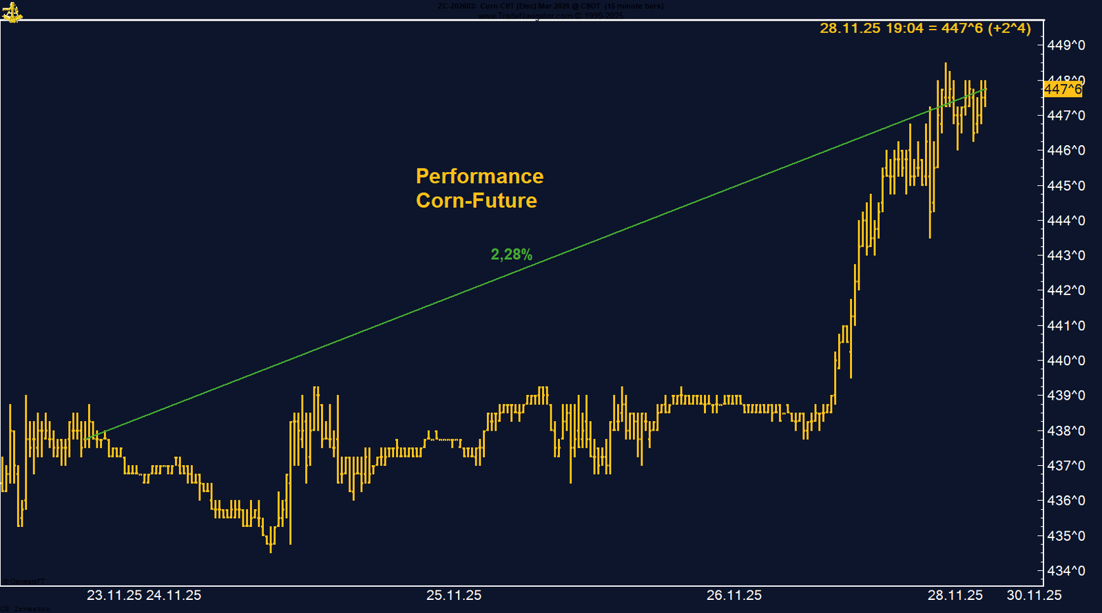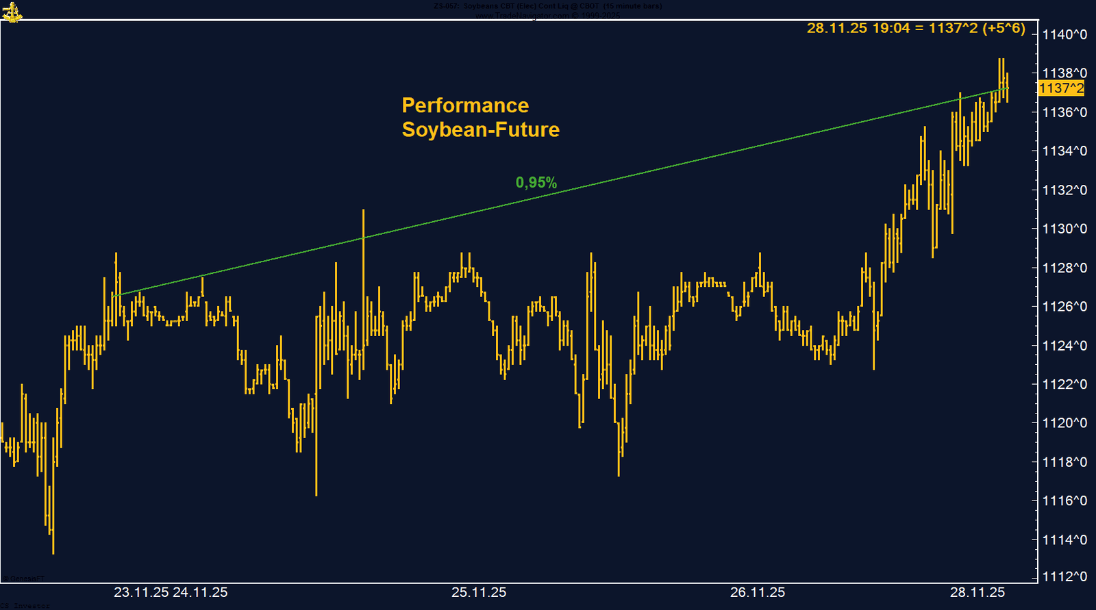 Der Sojabohnen-Future zeigt eine konstruktive Stabilisierung mit ersten klaren Nachfrageimpulsen aus China und einer bullischen spekulativen Positionierung. Kurzfristig bleibt der Markt wetter- und nachrichtengetrieben, mittel- bis langfristig hängt das Upside-Potenzial vor allem von Südamerika ab. In der aktuellen Struktur überwiegen jedoch die Chancen gegenüber den Risiken – besonders angesichts der breiteren Rohstoffrotation und einer Positionierungsdynamik, die weitere Käufe begünstigt.