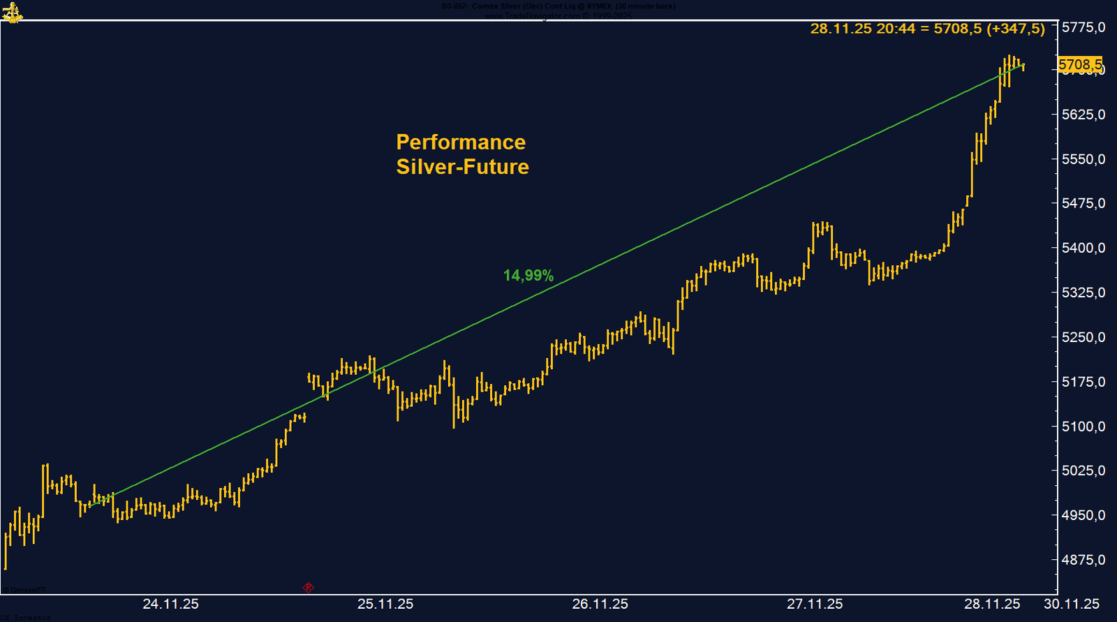 Silber befindet sich in einem glasklaren Bullenmodus mit einem strukturellen Breakout auf neue All-Time-Highs. Die fundamentale Lage ist eng, die makroökonomische Kulisse unterstützt, und saisonal beginnt gerade erst die stärkste Phase des Jahres. Die Positionierung ist moderat – ein Setup, das zusätzliche Trendfolger anziehen dürfte. Solange Silber über dem Ausbruchsbereich bleibt, bleibt der Weg nach oben weiter offen.