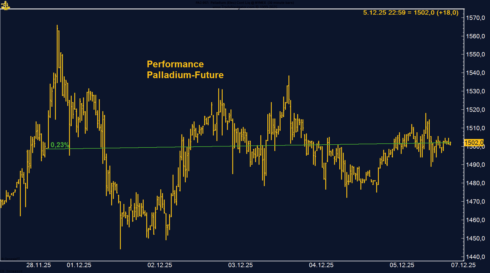 Wir halten unsere Position. Die technische Lage bleibt fest, die Saisonphase hat erst begonnen und die politische Rahmensituation spielt Palladium in die Karten. Rücksetzer sehen wir als Chance; ein Test der Hochs der Vorwochen wäre aus heutiger Sicht absolut plausibel.