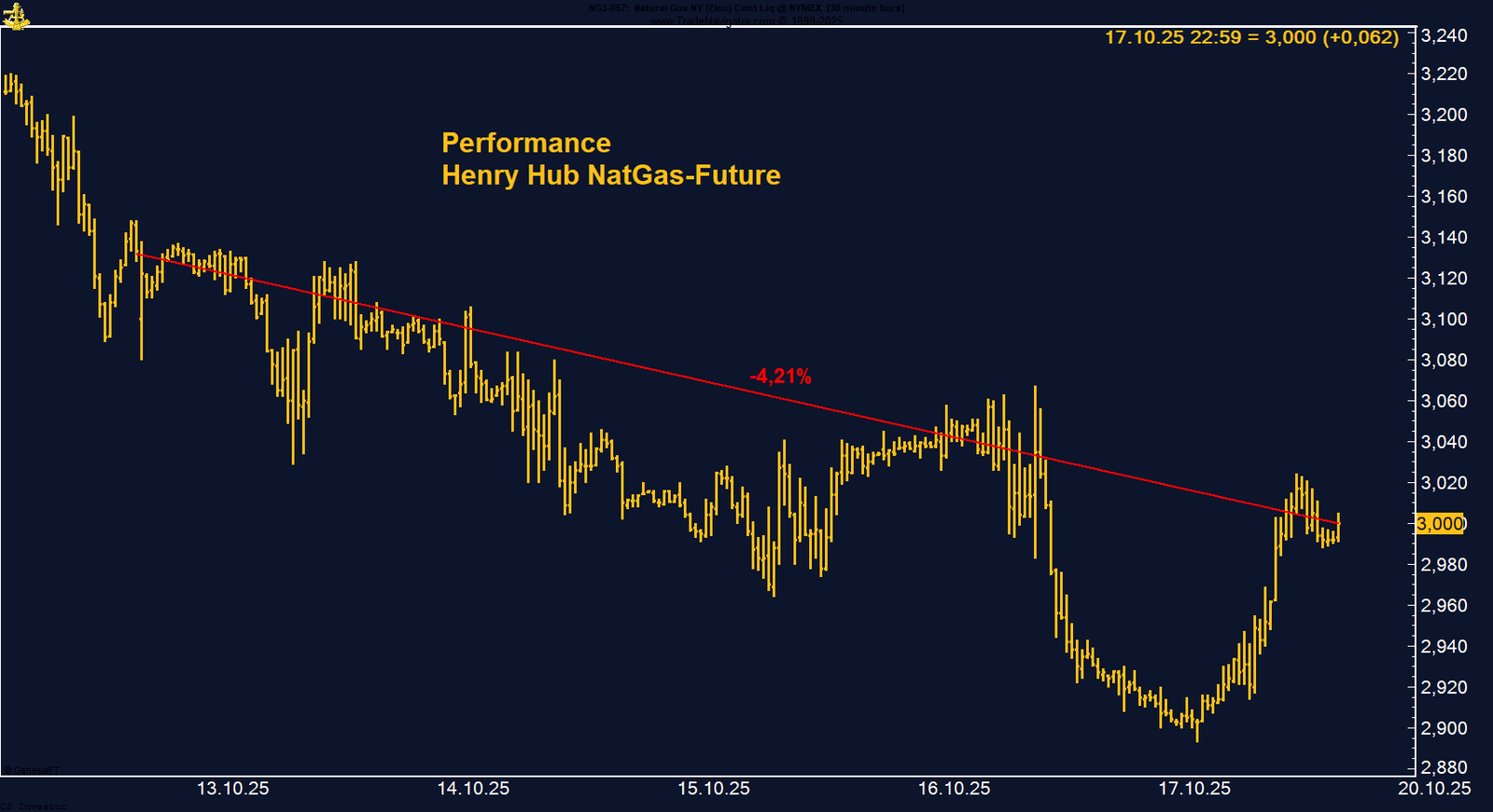 Der Natural Gas Future hat eine erste technische Gegenbewegung gestartet – getragen von Wetterumschwung und Short Covering. Noch ist der Trend klar abwärtsgerichtet, doch die überverkaufte Lage und das bevorstehende Winterhalbjahr sprechen für eine mögliche Trendwende in den kommenden Wochen. Ein Anstieg über 3,10 USD wäre das erste technische Signal, dass die Bären ihre Kontrolle verlieren.