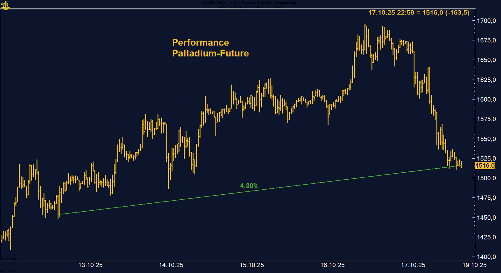 Palladium hat nach seiner beeindruckenden Rally eine verdiente Verschnaufpause eingelegt. Der Rücksetzer ändert nichts an der bullischen Grundtendenz – im Gegenteil: Das Zusammenspiel aus anhaltenden Lieferengpässen, robuster Industrienachfrage und dovisher Geldpolitik spricht weiterhin für eine strukturell enge Marktverfassung. Kurzfristig könnten sich um 1.500 USD solide Unterstützungszonen bilden. Bleibt die geopolitische Lage angespannt und die Fed auf Lockerungskurs, dürfte Palladium in den kommenden Wochen erneut Anlauf auf die Zone um 1.700 USD nehmen.