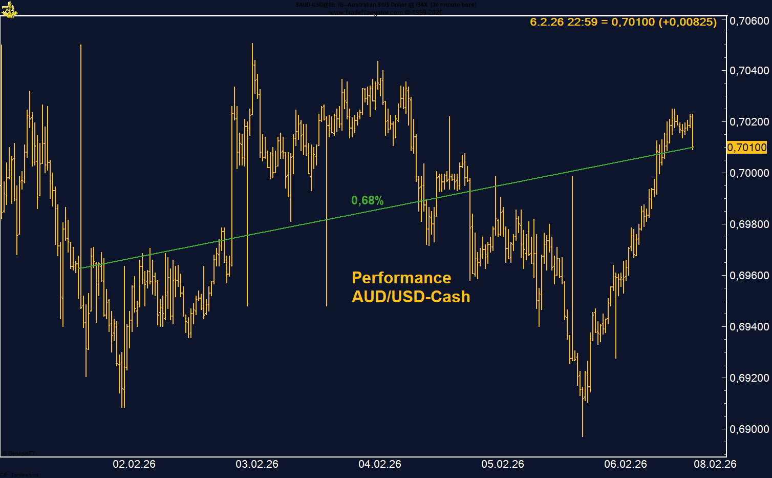 Rücksetzer unter 0,69 wurde sofort gekauft. Zinsdifferenz und gedrehte Spekulantenpositionierung sprechen weiterhin für einen stabilen Aufwärtstrend.